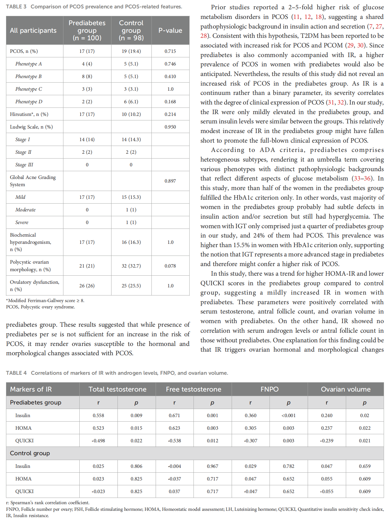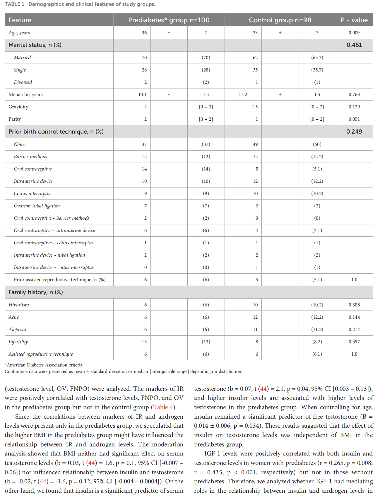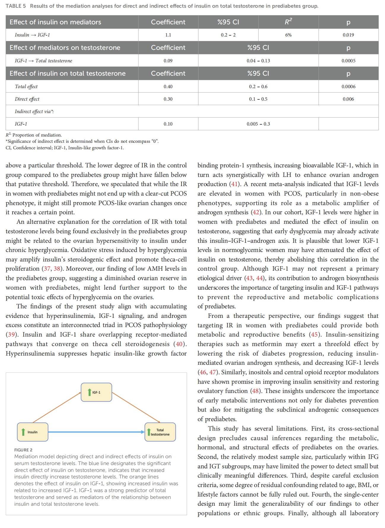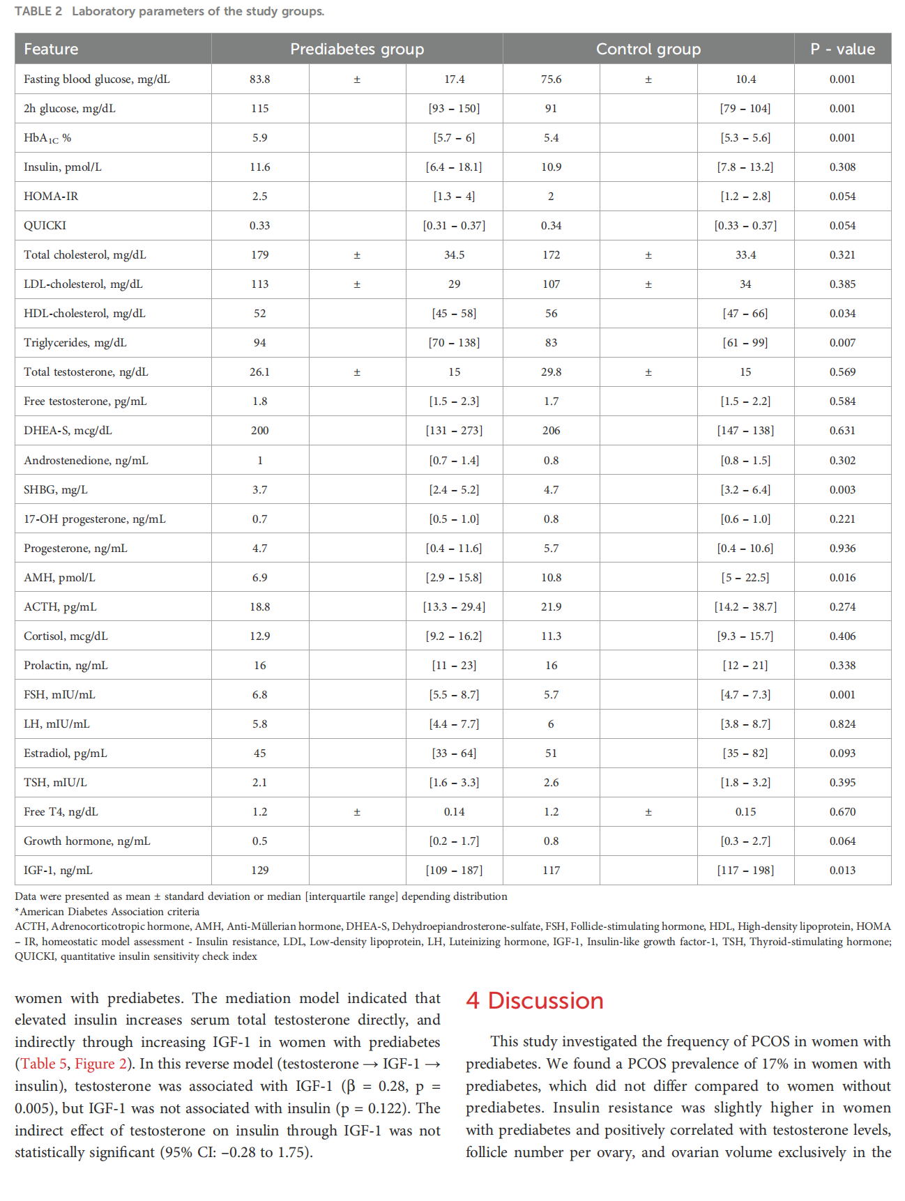 Results: 100 women had prediabetes and 98 women had normoglycemia. The frequency of PCOS were 17% and 19.4% in prediabetes and control groups, respectively (p=0.715). The frequency of PCOS was 24% (6/25) in women with impaired glucose tolerance (IGT) only, 22.2% (2/9) in women with impaired fasting glucose only, and 15.5% (9/58) in women who met the HbA1C criterion only. Prediabetes group had higher insulin-like growth factor-1 (IGF–1) levels and lower anti-Müllerian hormone (AMH) levels (p<0.05). Insulin was correlated with testosterone, antral follicle count, and ovarian volume only in prediabetes group (p<0.05). Mediation models showed that insulin increased testosterone both directly and indirectly through increasing IGF-1 (b=0.4, p=0.0006).