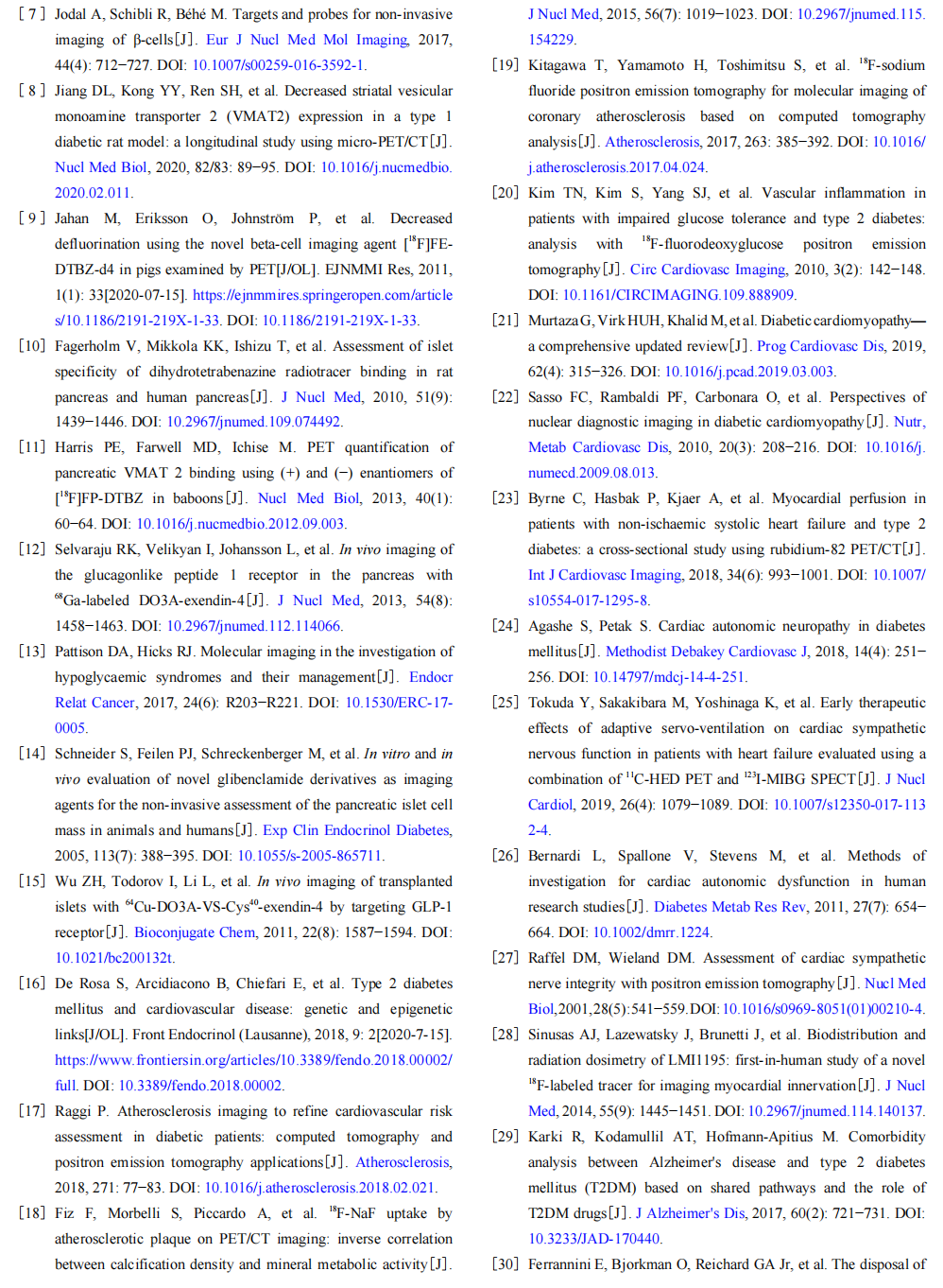 以上研究结果表明,PET 和 SPECT 可对心脏自主神经功能进行无创、实时的评估,并可能成为诊断显像的常规方法,同时可监测晚期糖尿病患者心脏自主神经病变的进展情况,以预防心肌梗死和心脏性猝死。