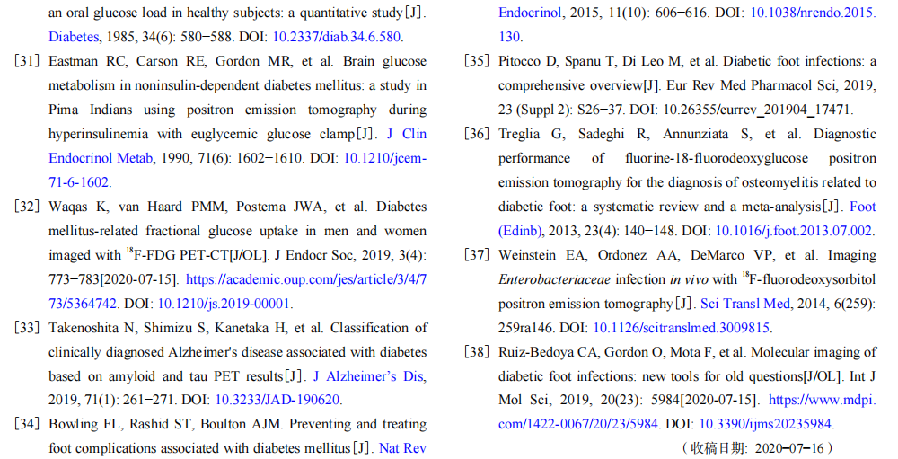 在过去的十年中,18F-FDG PET 提供了各种组织中葡萄糖代谢的实时动态图像,大大扩展了我们对糖尿病的发病机制及其并发症的认识。PET 在研究糖尿病及其并发症发生、发展的机制(如血流、葡萄糖转运蛋白移位、下丘脑和棕色脂肪的变化)上具有独特的优势。因此,将分子影像学技术与传统的糖尿病研究方法相结合,对糖尿病及其并发症的早期诊断和治疗具有重要意义。