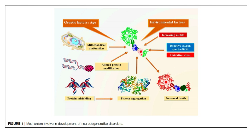 In so far as lifetime occurrence is to be considered, neurological diseases represent a significant load of chronic disability and financial burden globally especially in the older age group (Whiteford et al., 2015). As the aging population increases consistently, the prevalence of most neurological disorders has increased dramatically from the years 1990–2016 with a rate up to 117% (Nichols et al., 2019). Two of the most commonly seen neurological disorders are Alzheimer’s disease (AD) and Parkinson’s disease (PD) which are neurodegenerative in nature. AD affects about 6–10% of people over 65 years (Burns and Iliffe, 2009; Hebert et al., 2013). This disease is associated with neuroinflammation and atrophy with extracellular amyloid plaques and intraneuronal tau protein neurofibrillary tangles in brain tissue. The exact etiology of the neurodegenerative disorder remains unclear, but it is most likely to be resulting from both genetic and environmental factors interactively (Jiang et al., 2013). Clinically, commonly encountered symptoms are a significant intellectual decline from a previously higher cognitive level, memory loss, disorientation to time and place, behavioral disturbances, personality changes, and loss of interest in previously joyful activities. The onset of symptoms is frequently gradual and they usually interfere with patients’ ability to perform everyday activities (Alzheimer’s Disease, 2016).