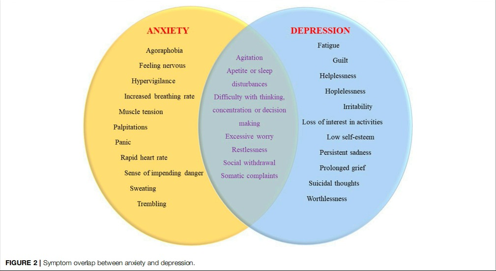 The definition of anxiety is a feeling often accompanied by subjective unpleasant emotions, along with somatic complaints, rumination, and restless movements, often characterized by fear and worry about the future (Figure 2) (Newman et al., 2013). Anxiety disorders, on the other hand, refer to pathological conditions of patients who meet the appropriate standards for a specific period of time based on certain diagnostic criteria. In this case, the severity of anxiety is excessive, it occurs in an inappropriate context and long in duration (Andrews et al., 2010). The incidence of anxiety disorders is approximately 10–14% and the lifetime prevalence is almost as high as 30%. Female predominance stands out with a two-fold increase in the rate, and disease onset is usually before the age of 30 (Bandelow and Michaelis, 2015). The most common subtype is a specific phobia and the second is a social anxiety disorder. As with most psychiatric disorders, anxiety disorders are affected by a complex combination of environmental and genetic factors. To receive the diagnosis, the symptoms must be severe and disrupt daily life activities. Medical conditions that can cause anxiety include heart disease, hyperthyroidism, alcohol, caffeine, or cannabis use, and withdrawal from certain medications (McLean et al., 2011). Dysfunctions and overstimulation in the neural circuit involving the amygdala and hippocampus which maintains HPA axis control over the sympathetic nervous system regulates emotions and establishes emotional memory are thought to play the main role in the formation of anxiety (Dresler et al., 2013). The influence of neurotransmitters like serotonin and norepinephrine has been implicated and constructed as the basis for treatment strategies (Nuss, 2015). Novel studies have broadened the perspective into specific cell groups in amygdala nuclei as well as drew attention to CRH interactions with the help of neuroimaging studies (Hamati, 2018). The fundamental concept underlying the psychological theories is that anxiety is an overwhelmed reaction of the human psyche against situations of uncertainty (Bateson et al., 2011).