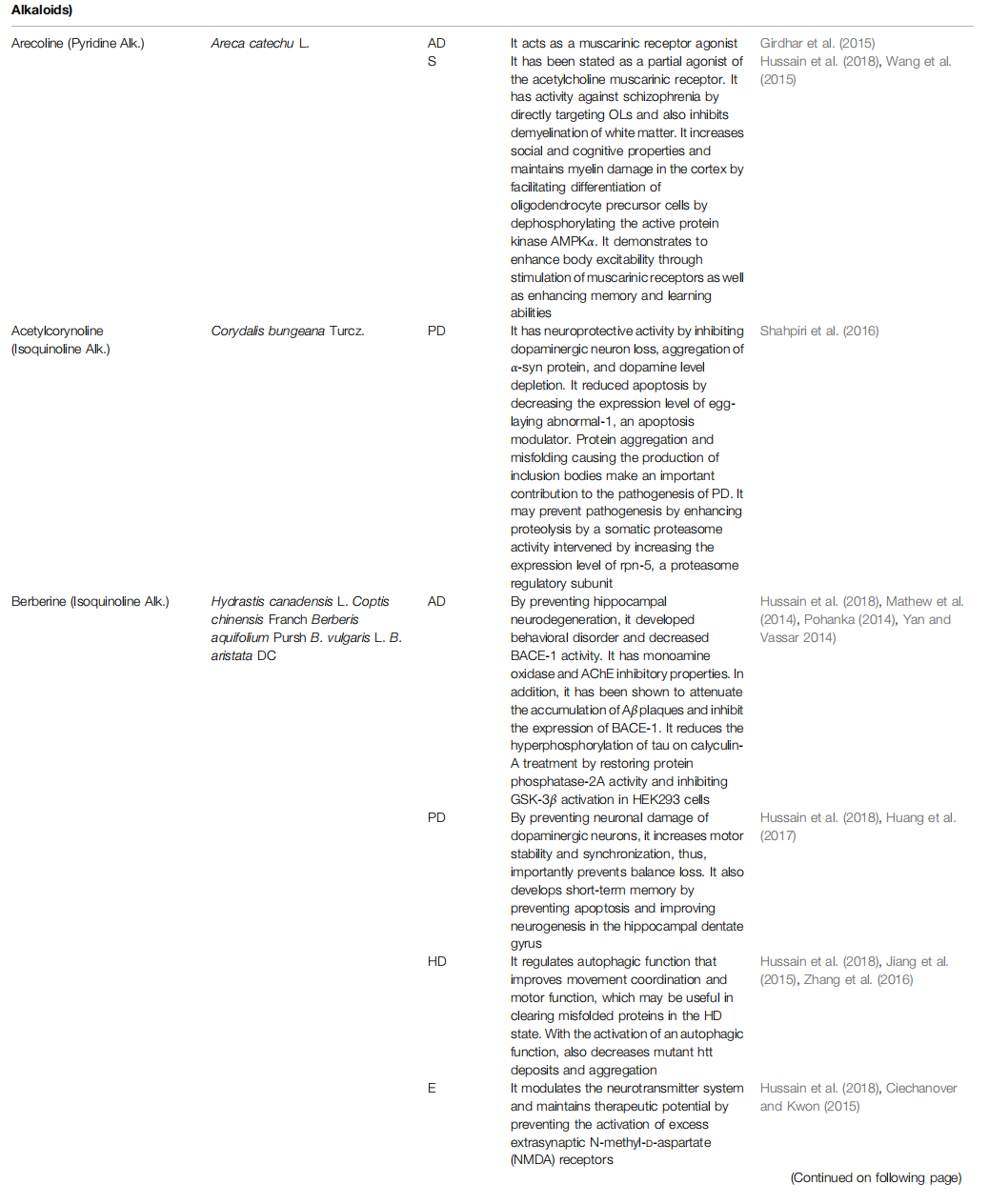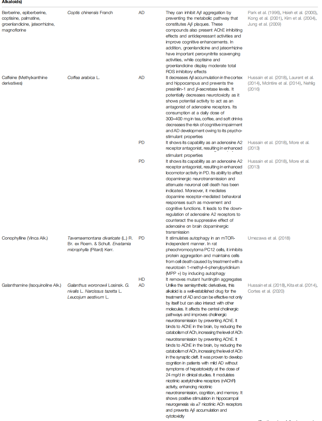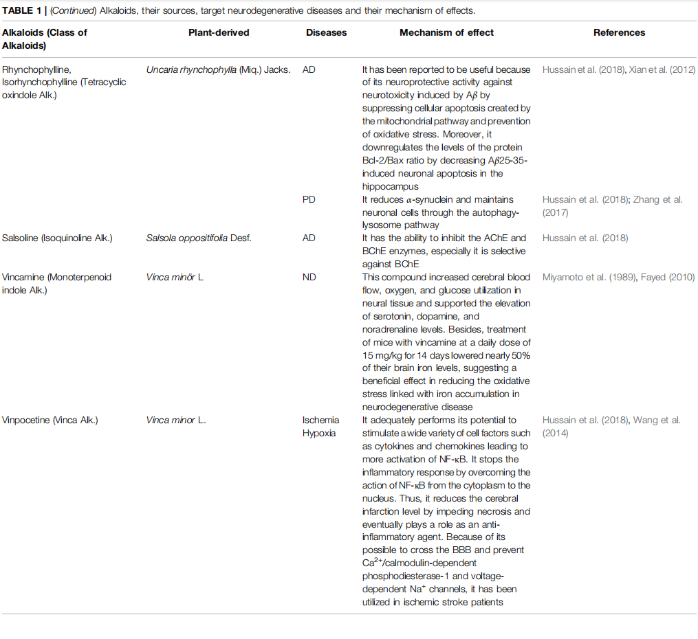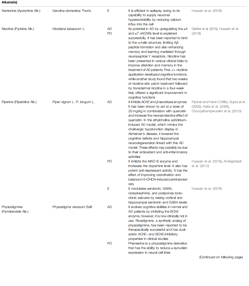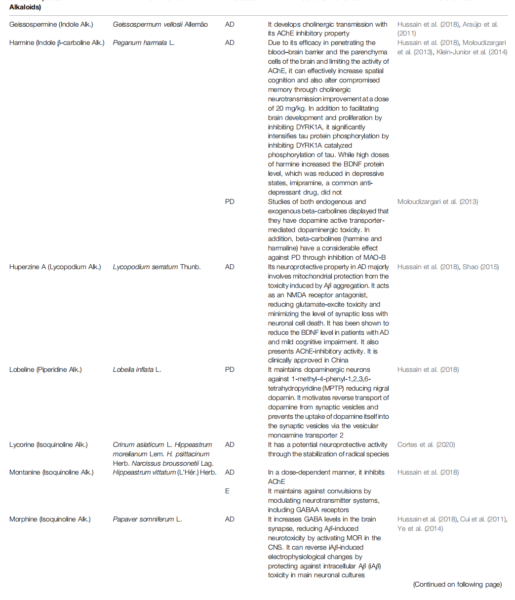 Alkaloids are naturally consisting components from carbon, hydrogen, oxygen, and nitrogen molecules, and are found especially in flowering plants. Families like Amaryllidaceae, Papaveraceae, Solanaceae, and Ranunculaceae are largely rich in various types of alkaloids (Girdhar et al., 2015; Bayazeid et al., 2020). Among the alkaloid compounds used in neurodegenerative diseases, there are indole, oxindole, pyrroloindole, isoquinoline, aporphine, pyridine, piperidine, β-carboline, vinca, and methylxanthene derivatives. These compounds are muscarinic and adenosine receptors agonists, anti-amyloid and MAO inhibitors, acetylcholinesterase (AChE) and butyrylcholinesterase (BChE) inhibitors, an inhibitor of α-synuclein aggregation, dopaminergic and nicotine agonists, and an N-methyl-D-aspartate antagonist (NMDA). Therefore they play positive roles in improving the pathophysiology of this kind of diseases, including Alzheimer's disease (AD), Parkinson's disease (PD), Huntington disease (HD), schizophrenia (S), epilepsy (E), and stroke (Table 1) (Ng et al., 2015; Hussain et al., 2018).