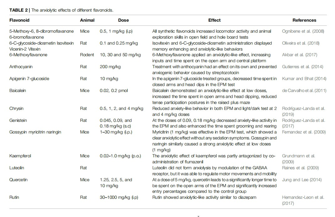 Two behavioral models, p-chlorophenylalanine stimulated depletion of serotonin and reserpine-stimulated hypothermia and ptosis, have been appointed to investigate the antidepressant effect of fisetin (3,3′,4′,7-tetrahydroxyflavone). The results showed that doses of fisetin 10 and 20 mg/kg (p.o) inhibit the duration of immobility in behavioral tests, and the doses affecting the immobile response did not affect locomotor activity. In addition, it was stated that 14.7% inhibition on MAO activity was found in the mouse brain and MAO-B activity was not affected with fisetin treatment (Zhen et al., 2012). Apigenin has been demonstrated to have antidepressant effects. Inhibition of MAO activity, reduced GABA andNMDA receptors function, decreased immobility time in theFST with an increase in dopamine turnover in the hypothalamus has been proven by different studies (Lorenzo et al., 1996; Skolnick, 1999; Nakazawa et al., 2003; Han et al., 2007). To better understand the behavioral effects of chronic oral apigenin treatment, FST was performed in exposed male ICR mice and male Wistar rats. Apigenin attenuated changes in serotonin (5- HT), its metabolite 5-hydroxyindoleacetic acid (5-HIAA), dopamine (DA) levels, and 5-HIAA/5-HT chronic ratio in different rat brain regions. Treatment of oral apigenin has a combination of multiple biochemical effects and has been reported to help to clarify the mechanisms of action that play a role in the normalization of stress-stimulated alterations in brain monoamine levels (Yi et al., 2008). On behavioral changes, insulin signaling and CREB-BDNF axis in the hippocampus of high-fat, high-fructose-diet-fed rats were used to evaluate apigenin’s antidepressant effect. The experimental results have revealed that apigenin significantly improves Glucagon-like peptide levels, cognitive function, insulin signal, and affects the CREB (cAMP response element-binding)-BDNF axis. The binding of the CREB protein to the promoter IV of the BDNF gene was increased in animals that received apigenin (Kalivarathan et al., 2020).
