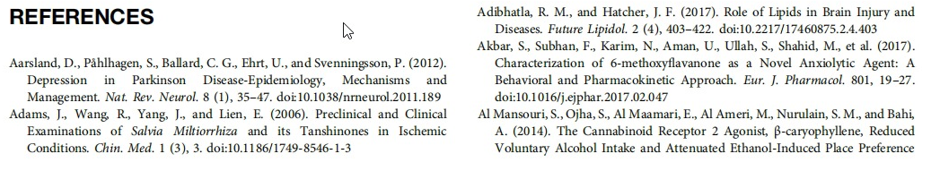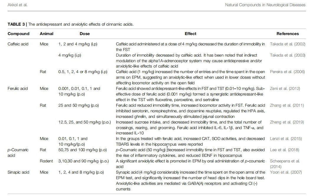 The antidepressant and anxiolytic effects of cinnamic acids with samples such as caffeic acid, p-coumaric acid, sinapic acid, and ferulic acid with the C6-C3 skeleton are summarized in Table 3. The conducted researches reveal that the antidepressant activities of these cinnamic acids come into existence via substantial neurotransmitters such as serotonin, and besides by the participation of inflammation-associated metabolites such as AA-COX-2/5-LOX and BDNF (Diniz et al., 2019).