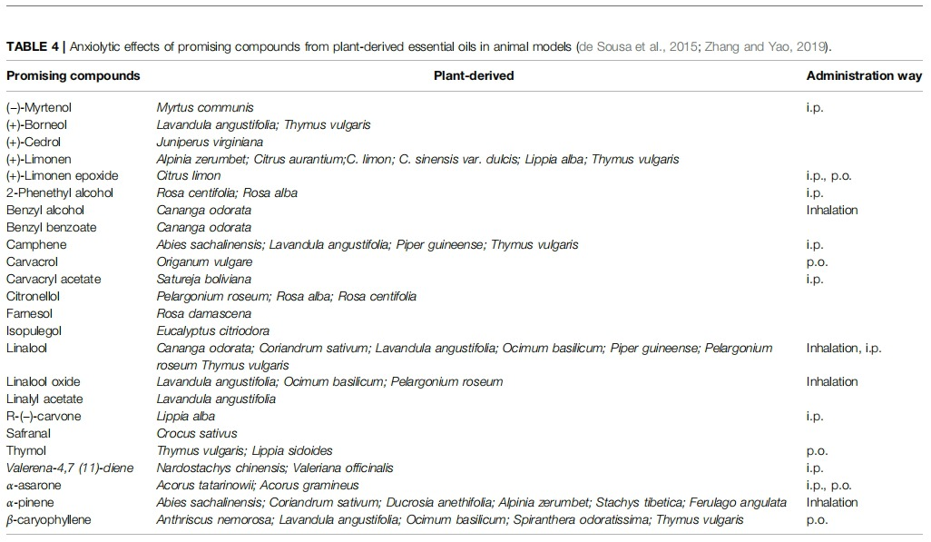 Anxiolytic effects of promising compounds from plant- derived essential oils in animal models is summarized in Table 4.