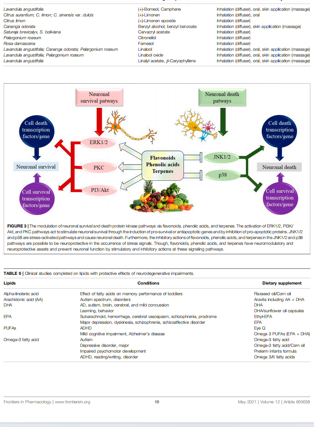 Anxiolytic effects of promising compounds from plant- derived essential oils in clinical trials are summarized in Table 5. The interaction of various flavonoids, phenolic acids, and terpenes in various ways and providing protection against neurodegeneration is summarized in Figure 3.