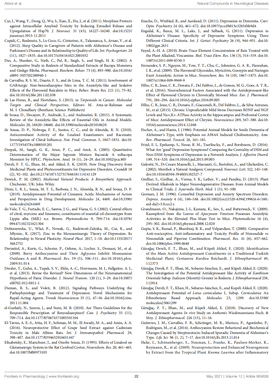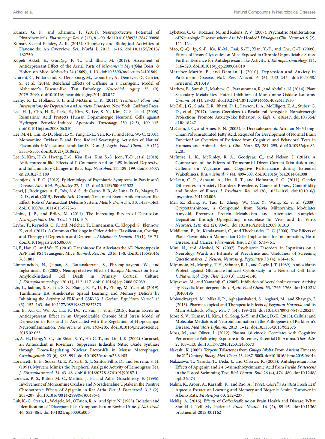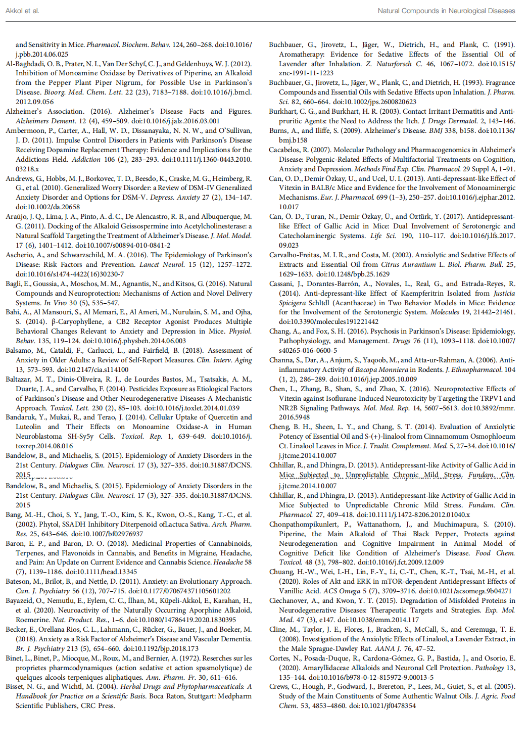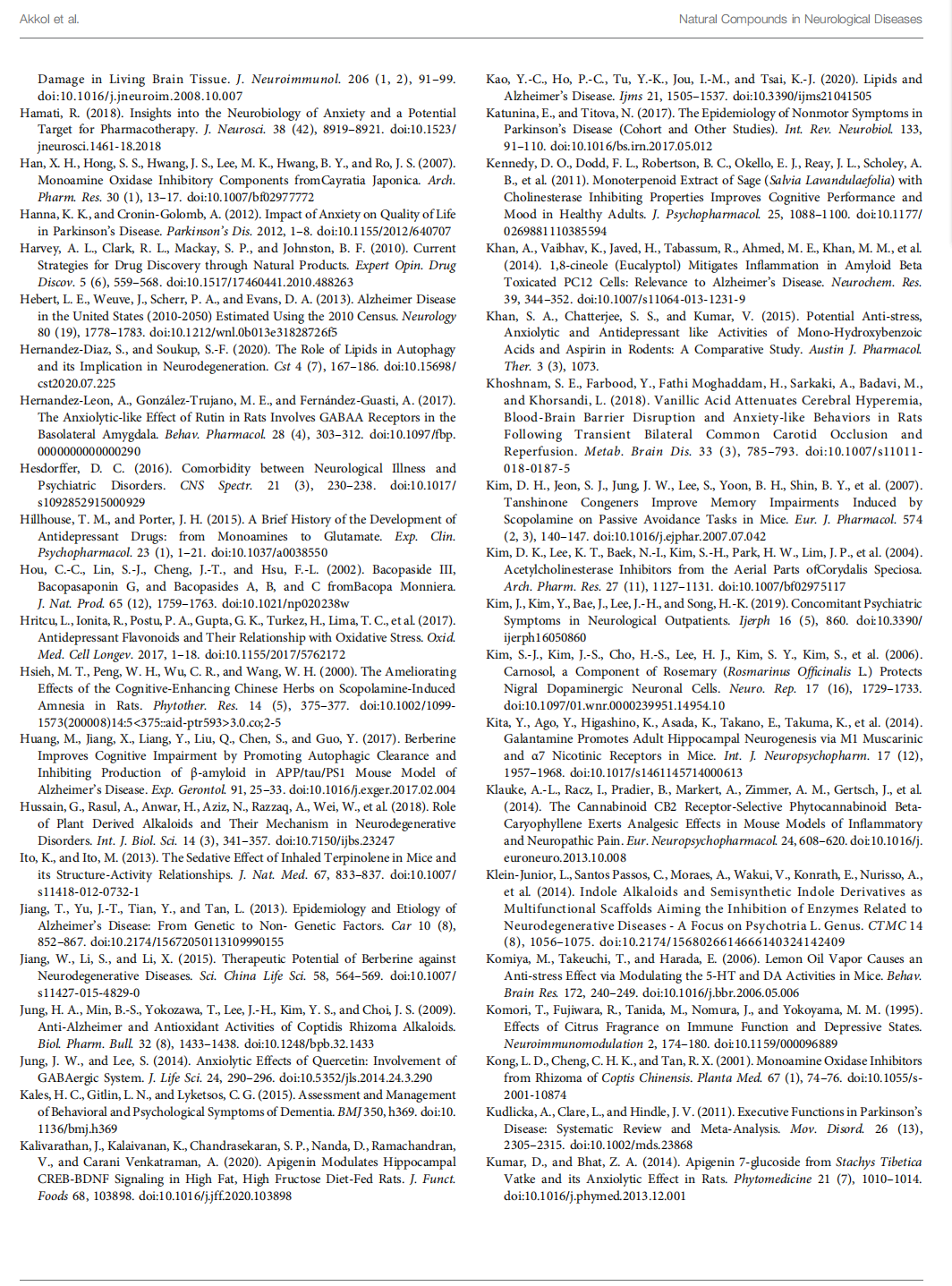 Natural products have a wide range of pharmacological or biological activity making them proper candidates for the treatment of neurological disorders, neurodegenerative diseases, and related psychiatric disorders (Harvey et al., 2010). Many studies on the identification and discovery of new neuroprotective drugs have displayed that natural bioactive compounds have possible as neuroprotective agents against various types of neurodegenerative disorders. They exhibit their neuroprotective effects through different mechanisms. It is known that secondary metabolites belonging to many classes of chemical compounds, especially diterpenes and cyclodepsipeptides, interact with the γ-aminobutyric acid (GABA)-A receptor. Secondary metabolites that positively affect the binding of muscimol to the GABA receptor complex are alkaloids. Similarly, the tendency of some flavonoids to bind to the benzodiazepine site on the GABAA receptor has been demonstrated, and their anti-inflammatory and antioxidant effects also contribute to the activity (Rehman et al., 2019). They have also been demonstrated to modulate multiple signaling pathways through direct effects on enzymes such as kinases, regulatory receptors, and proteins (Bagli et al., 2016; Wang et al., 2017).