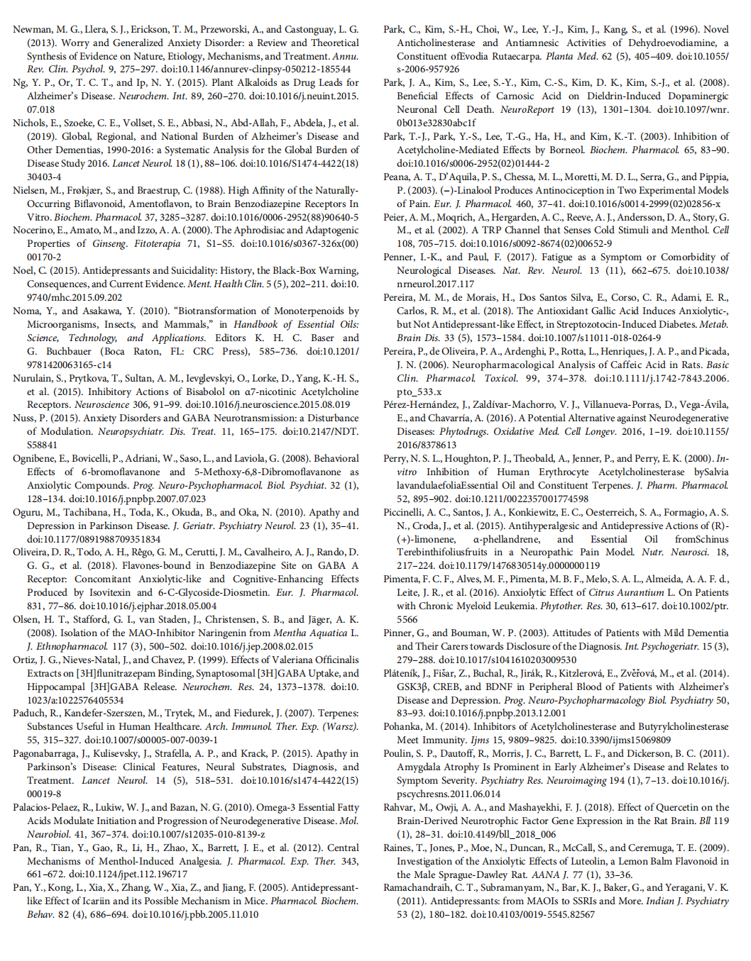 Limonene is found in the peels of all citrus fruits and is the second most common terpenoid in nature (Noma and Asakawa, 2010). Researches have presented properties including antidepressant and immunostimulating effects (Komori et al., 1995). Besides, limonene has been displayed to cause sleep and muscle relaxation (do Vale et al., 2002) being a potent anxiolytic in mice (Carvalho-Freitas and Costa, 2002). It decreased anxiety in patients with chronic myeloid leukemia (Pimenta et al., 2016). Limonene has been presented to increase the metabolic conversion of dopamine in the hippocampus and serotonin in the prefrontal cortex and striatum, suggesting that anxiolytic and antidepressant-like effects can consist of suppressing dopamine activity associated with increased serotonergic neurons through 5-HT1A (Komiya et al., 2006). Limonene displayed 10–12% enzyme inhibition for AChE and BChE at the maximum concentration of 2.03 mmol/L (Szwajgier and Baranowska-Wójcik, 2019).