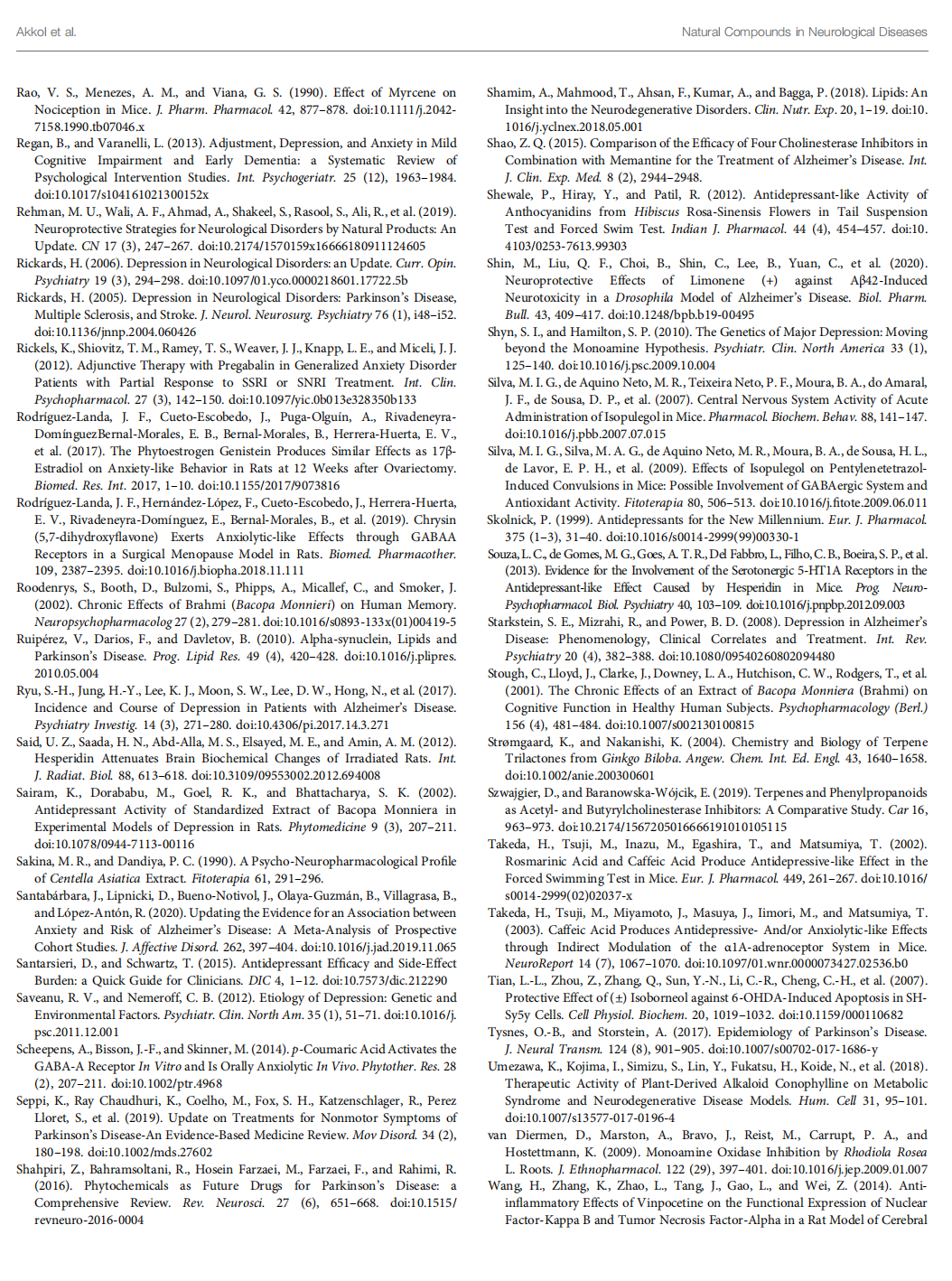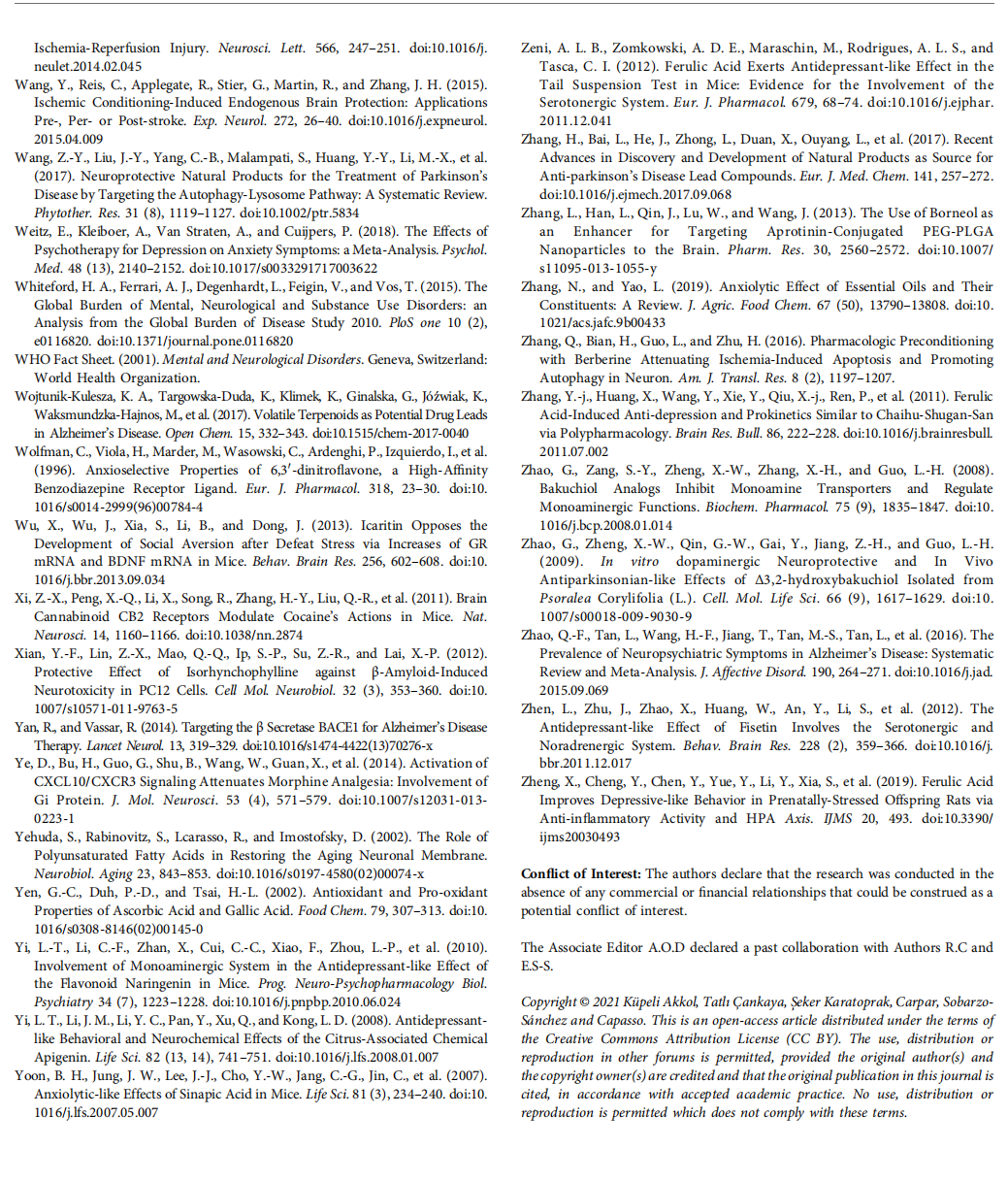 FST was performed to analyze the antidepressant potency of vanillic acid and its relationship with the Akt, ERK, and mTOR signaling and upstream α-amino-3-hydroxy-5-methyl-4- isoxazolepropionaic acid receptor (AMPAR) in the prefrontal cortex of mice. Vanillic acid exhibited antidepressant activity by considerably lowering behavioral disorder in FST. Besides, it was stated that vanillic acid augmented AMPAR efficiency, Akt, and mTOR signal, but did not increase ERK signal in the prefrontal cortex. According to the experimental results, the authors have revealed an Akt-dependent but ERK-independent mechanism underlying the antidepressant activity of vanillic acid, which may be helpful in some depression patients (Chuanget al., 2020). After treatment with vanillic acid (10, 30, and 100 mg/kg) for 2 weeks, chronic cerebral hypoperfusion was induced in rats. Pretreatment with vanillic acid improved sensory-motor signs and anxiolytic behavior compared to thecontrol group (Khoshnam et al., 2018).