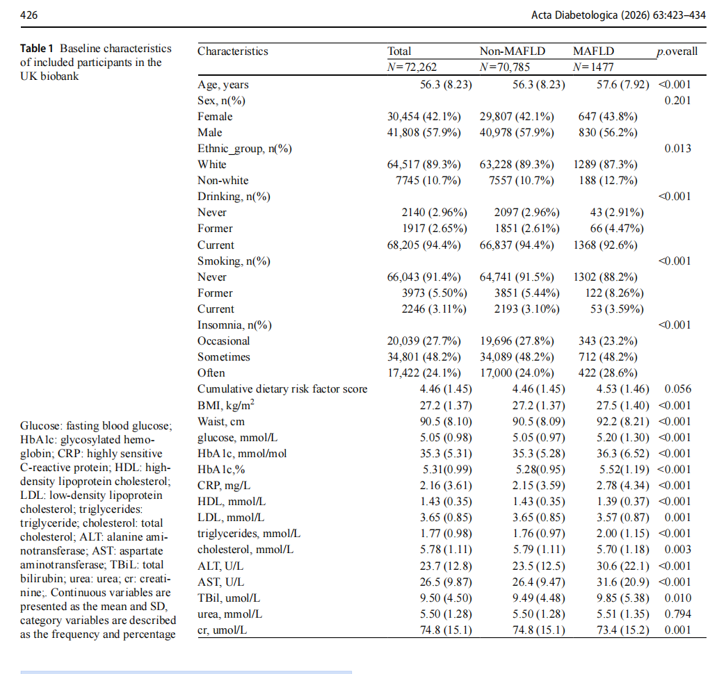 The primary outcome of this study was MAFLD. By using the International Classification of Diseases, 10th revi-sion (ICD-10) and the Expert Panel Consensus Statement, MAFLD was defined as ICD-10 code K76.0 (fatty [change of] liver, not elsewhere classified) and K75.8 (other speci-fied inflammatory liver diseases). The secondary outcome was all-cause mortality. Death outcomes were identified through linkage to national death registries, and detailed death registration information can be found at link https://biobank.ndph.ox.ac.uk/~bbdatan/Death SummaryReport.html.