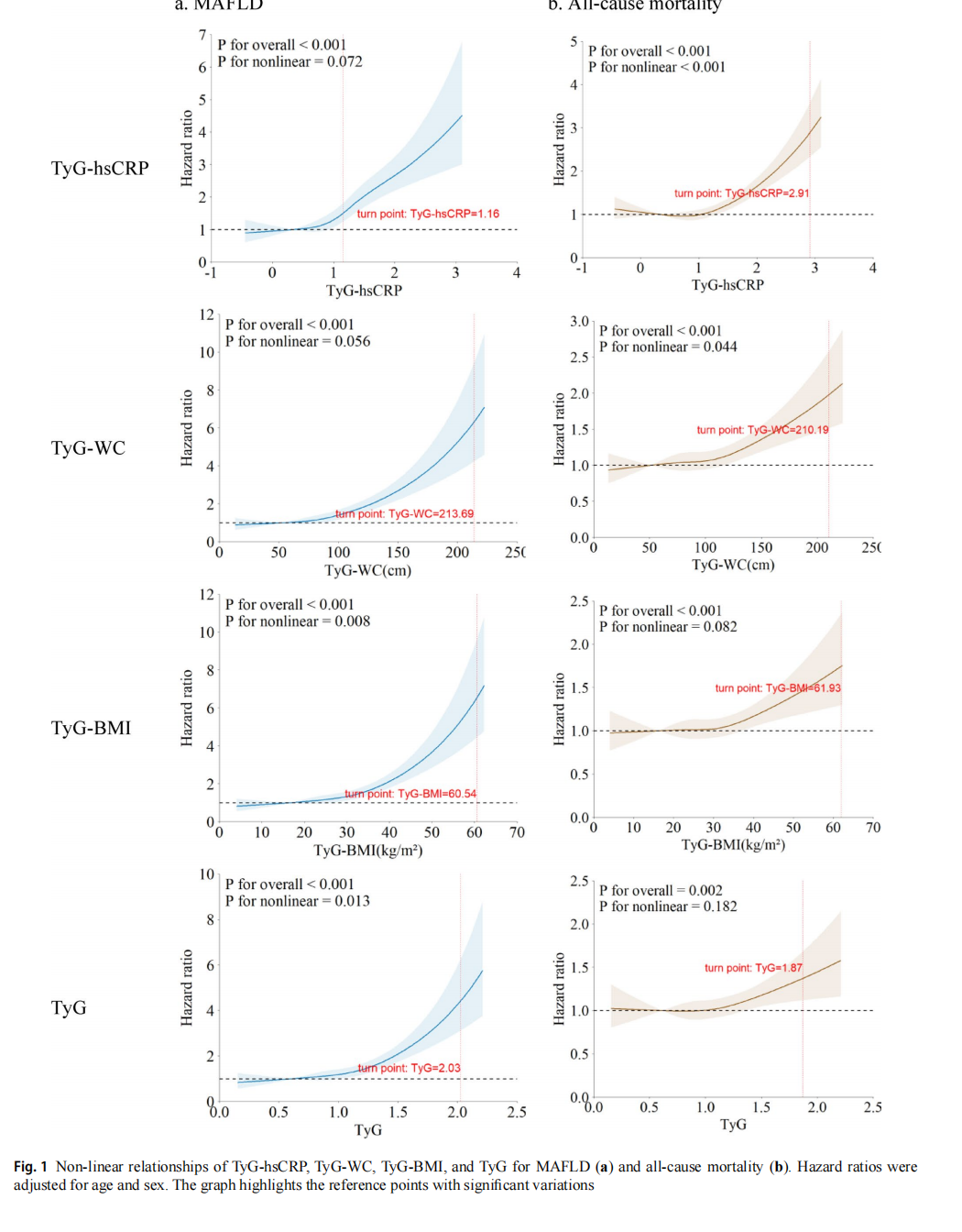 The RCS analysis showed a nonlinear positive associa-tion between TyG-hsCRP and the future risk of all-cause mortality (p for nonlinear<0.05). The turning points for TyG-hsCRP in MAFLD and all-cause mortality were 1.16 and 2.91, respectively. Similarly, results revealed a nonlin-ear relationship between TyG-WC and all-cause mortality, TyG-BMI and MAFLD, TyG and MAFLD (Fig. 1).