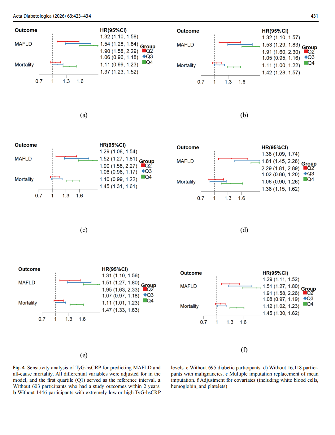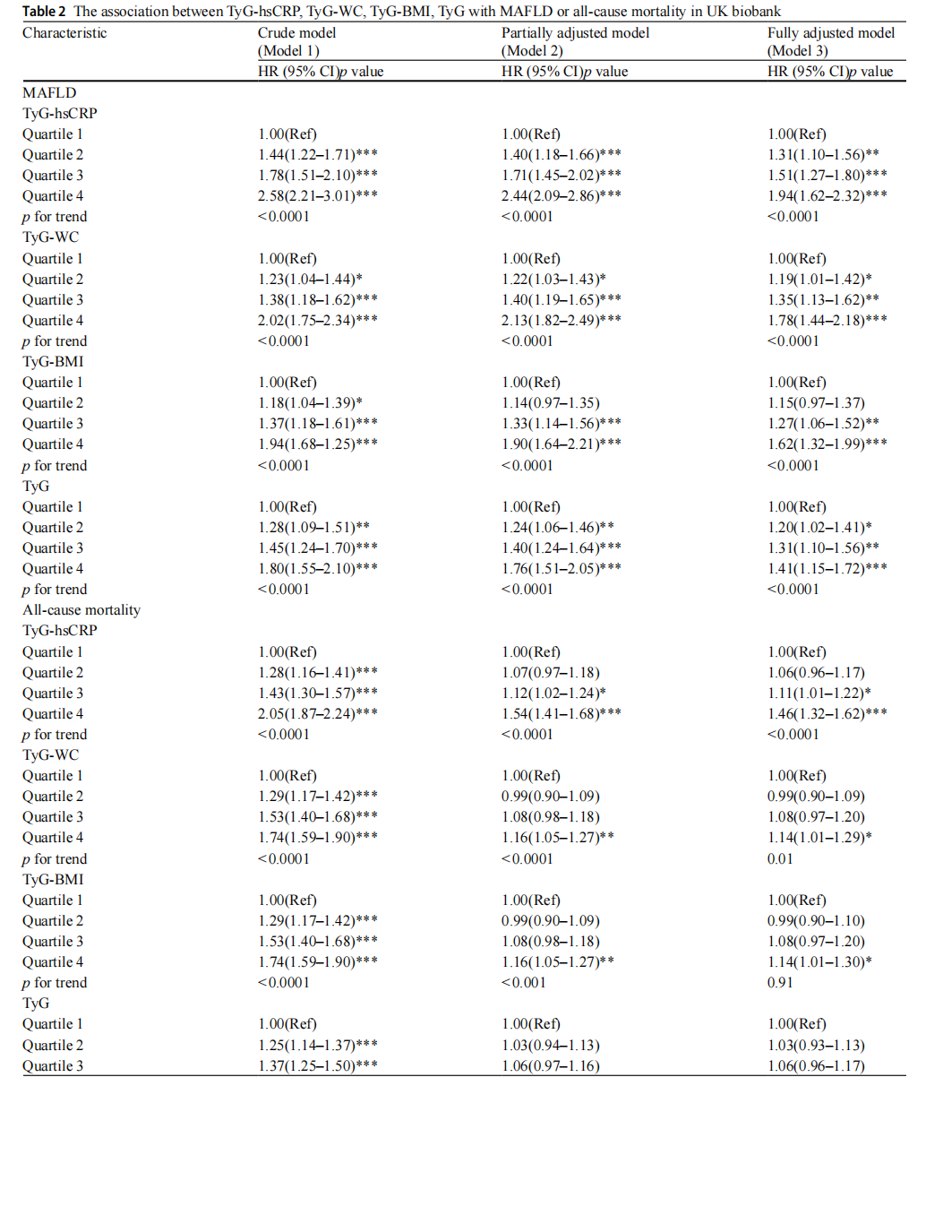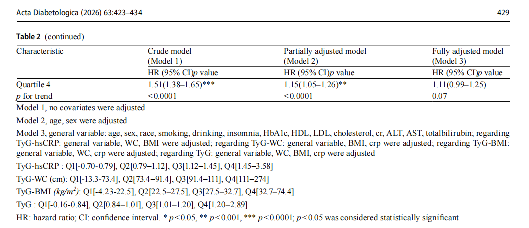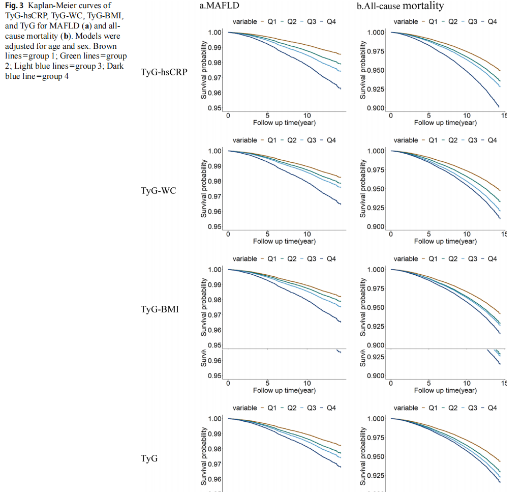 The exposure variables TyG-hsCRP, TyG-WC, TyG-BMI, and TyG were divided into quartiles from lowest (Q1) to highest (Q4). The risk calculation was based on Q1, includ-ing hazard ratio (HR), 95% confidence interval (CI) and corresponding p-value. Mean interpolation was used in missing continuous variables, and missing categorical vari-ables were excluded. Continuous variables were expressed as mean and standard deviation (SD), and categorical vari-ables were expressed by frequency and proportion. The trend test was performed using the interval median value. The t test (continuous variable) or chi-square test (categori-cal variable) were used to assess the differences between subjects grouped by quartiles. Characteristics of participants were compared based on MAFLD. Variables between the 2 groups with a p value < 0.05 were included in subsequent multivariate adjustment models. We made a proportional hazards assumption for the Cox model, and no violations were detected (Fig. S2). In the analysis of TyG correlation index and outcomes, the models were as follows. Model 1 was unadjusted; Model 2 was par-tially adjusted; Model 3 was fully adjusted. Dose-response relations between TyG-hsCRP and outcomes were evalu-ated by restricted cubic splines (RCS) regression analysis. Cox proportional hazards models were employed to assess HRs and 95% CIs of TyG correlation index with outcomes. In order to weigh the advantages and disadvantages of each indicator, we calculated the time-dependent Harrell’s C-indices of TyG-hsCRP, TyG-WC, TyG-BMI, and TyG, and we selected the index with the highest predictive power for outcomes and conducted a subsequent primary analysis. In addition, we performed subgroup analyses based on age or sex to further compare C-indices [12]. The interaction of age, sex, ethnicity, smoking, drinking, and sleep in TyG-hsCRP with outcomes was analyzed using additive product terms in the Cox models. The Kaplan-Meier method was used to develop survival curves, and differences in survival were evaluated with a stratified log-rank test and a multi-variable Cox proportional-hazards model. To minimize errors in population selection, statistical methods, and vari-able inclusion, we conducted a comprehensive sensitivity analysis. Statistical analyses was performed using R studio software, version 4.3.2 and p values < 0.05 were consideredto indicate statistical significance.