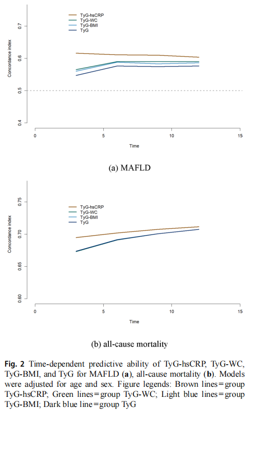 We calculated the time-dependent Harrell’s C-indices, and the results indicated for MAFLD, TyG-hsCRP exhib-ited the strongest predictive ability, followed by TyG-WC, TyG-BMI, and TyG. In terms of new-onset mortality, TyG-hsCRP again presented the strongest predictive power, while the predictive abilities of TyG-WC, TyG-BMI, and TyG showed no significant differences (Fig. 2). The pre-dictive power in gender subgroups and age subgroups was also compared. The results indicated, with the exception of MAFLD events in individuals over 60 years, where TyG-WC showed superior predictive ability, TyG-hsCRP consis-tently outperformed in other subgroups (Fig. S3-4).