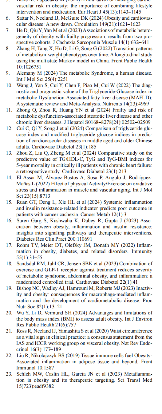 Excess weight is a complex metabolic condition associated with metabolic dysfunction-associated fatty liver disease (MAFLD), cardiovascular events, cancer, and all-cause mortality, affecting about 2 billion people worldwide and resulting in a huge economic burden [1]. Inflammation is a key driver of disease development in individuals with excess weight [2, 3], but high-intensity exercise may reverse the metabolic damage caused by chronic inflammation [4]. Many professional expert associations consider lifestyle changes, such as increased exercise and diet restriction, to be the cornerstone of obesity management [5, 6]. Many studies have analyzed the relations between body mass index (BMI) and metabolic phenotype with disease devel-opment [7], as well as the changes in metabolic phenotypes over time [8]. Although the criteria for metabolic syndrome have been established, they are still evolving, resulting in a lack of specific guidelines, which makes clinical inter-vention somewhat difficult to initiate [9]. Few studies have focused on the use of specific metabolic markers, such as insulin resistance (IR) and inflammation, to stratify high-risk populations and initiate early interventions in individu-als with excess weight.