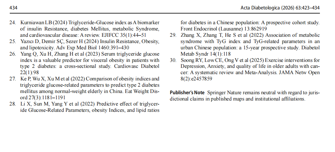 TyG is recognized as an indicator of IR, and a series of compound indicators have been derived. Studies have found that TyG can be used to predict type 2 diabetes, metabolic syndrome, cardiovascular events [24]. However, few studies have examined both TyG and inflammation, with the earli-est attempts focusing on cancer patients and involving only hsCRP [15]. Studies have shown that the composition and distribution of body fat is closely related to IR. Dysfunc-tional obese adipose tissue develops into insulin resistance and chronic low-grade systemic inflammation through lipo-toxicity [25]. Yang investigated TyG was an effective com-prehensive indicator for predicting fat volume, density and distribution, and it was an important predictor of visceral obesity when combined with BMI [26]. Given the correla-tion between IR and obesity, studies have begun to explore whether combining the TyG index with obesity-related indi-ces can enhance risk stratification. Due to differences in dis-ease outcomes, database selection and study design, there is controversy over the merits of TyG and related indices. Ke found combining TyG index with BMI and WC did not further improve identification of diabetes risk in the elderly population [27]. Li suggested TyG-BMI outperformed TyG in predicting new-onset diabetes [28]. Zhang found that TyG combined with obesity indices were superior for identifying metabolic syndrome in males and females [29]. However, it is evident that previous studies have primarily focused on the connection between IR and indicators of obesity risk. In contrast, our research broadens the scope by incorporating metabolic indicators and conducts a comprehensive com-parison with existing measures.