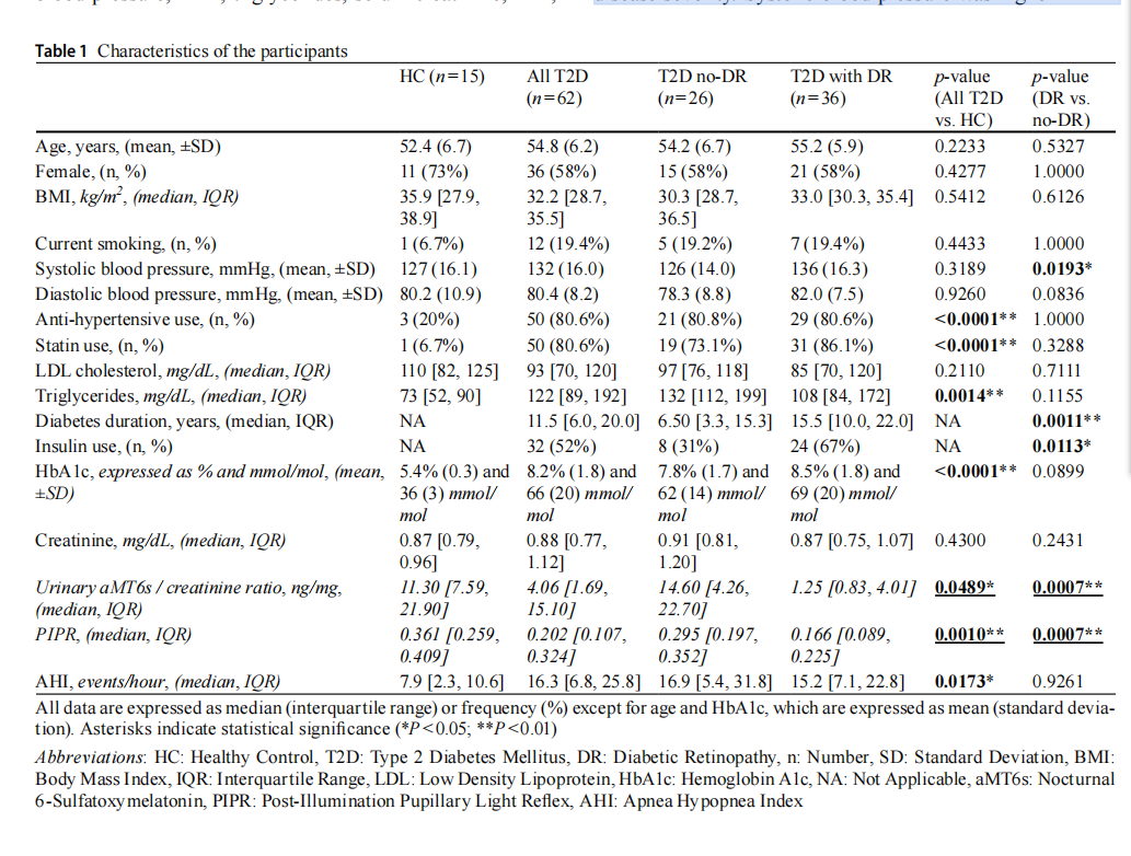 participants while urinary aMT6s and PIPR were lower. HCs demonstrated less medication use, lower triglycerides, blood pressure, HbA1c, and fewer AHI events than the total T2D group (DR and no-DR).