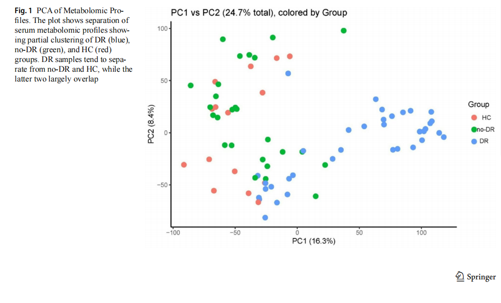 Our findings suggest that DR is associated with metabolic alterations beyond those seen in T2D alone. Unsupervised PCA revealed modest group separation between DR versus no-DR and HCs, supporting global metabolic differences in DR Metabolites differentially abundant in DR versus HCs completely overlapped with those identified in DR versus no-DR, supporting the robustness of these DR-associated metabolic alterations.