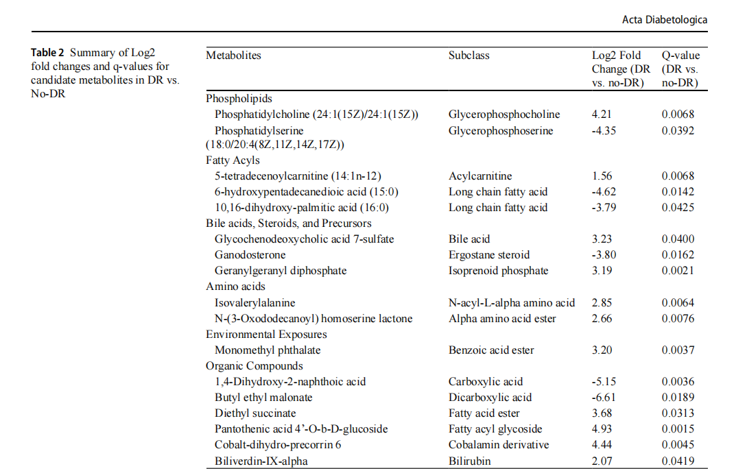 Findings included higher 5-tetradecenoylcarnitine and phosphatidylcholine (24:1/24:1) and lower long-chain fatty acids (6-hydroxypentadecanedioic acid (15:0) and 10,16-dihydroxy-palmitic acid (16:0)). Monomethyl phthal-ate, a metabolite linked to plastic exposure and endocrine disruption, was significantly elevated in DR. Two metabo-lites, 12-HETE and 3,4-DHBA, previously implicated in DR pathogenesis, were also significantly higher, although not above the log2 fold change≥1.5 threshold.