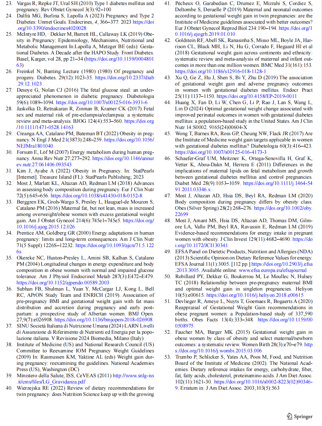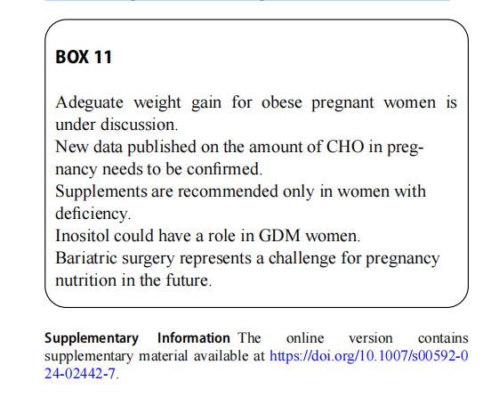 The correct gestational weight gain for women with pre-pregnancy BMI≥30 kg/m2 is still a controversial issue. Most et al. built a linear model to predict changes in body compo sition (fat mass, lean mass) in women with class 2 and class 3 obesity and with appropriate weight gain. Assuming an increase in free fat mass (FFM) comparable to other classes of BMI and the inverse association between pre-pregnancy BMI and fat mass gain across all BMI classes, their model predicted how maternal fat mass should be lost during preg-nancy in cases of morbid obesity (BMI≥40 kg/m2 ) in order to optimise pregnancy outcomes [47]. Studies on energy expenditure have shown that the recommended weight gain in pregnancies complicated by obesity is reached when the daily energy intake does not exceed total energy expendi-ture [48]. In fact, the energy requirements of obese women for foetal development should be offset by the mobilisation of maternal fat mass without negative effects on maternal and foetal outcomes. The authors proposed a daily reduc-tion of approximately 100 kcal to ensure the recommended weight gain [48]. The increase in energy needs in the sec-ond and third trimesters recommended by both international and Italian guidelines [37, 38, 49] should not, therefore, be applied universally to all BMI classes. Recent studies [50–52] have shown that little or no increase in weight or a modest weight loss can reduce the risk of LGA without a significant increase in SGA, suggesting that the weight gains recommended by the IOM should be re-evaluated for obese women and should be defined according to obesity class. There is also a need for further studies to assess the role of dietary patterns and quality. However, it is worth remembering that no data on calorie restriction in physi-ological pregnancy are currently available, and therefore extremely low-calorie diets are not recommended in cases of severe obesity.
