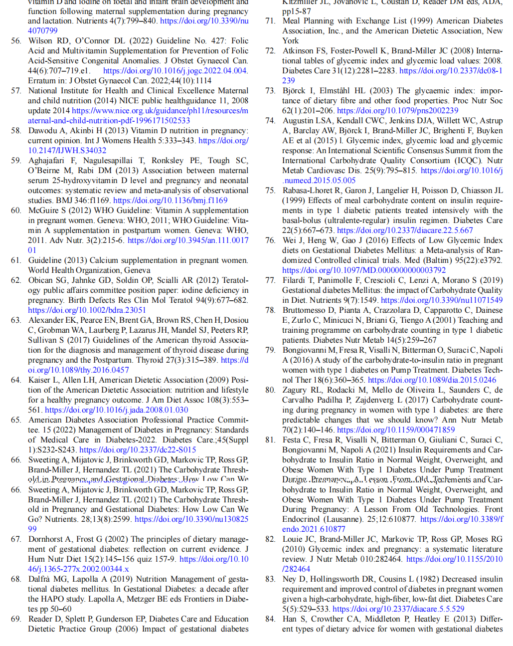 A 2021 report [66] that reviewed recent studies with the aim of identifying appropriate levels of CHO in GDM found a wide variation in intake (47–70%) and that CHO with a low glycaemic index had a lower impact on blood glucose while calorie restriction had a greater impact on foetal growth. A CHO intake≤165 mg/day (lower than the IOM recommendation) seems to be associated with a micronutri-ent deficiency, but further studies are necessary to evaluate its effects on ketonemia and on triglyceride and free fatty acid levels [66]. Excessive calorie restriction during preg-nancy is not indicated, including in GDM.
