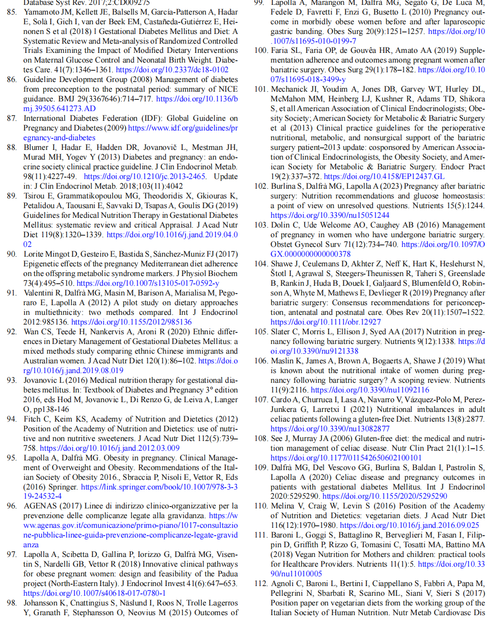 Maternal obesity is associated with a greater risk of obstetric and neonatal complications [95–97], so it is important that obese women are followed by a multidisciplinary care team in which the diabetologist/endocrinologist and the gynaeco-logist are supported by a dietician to develop a dietary plan that is personalised and provides the correct weight gain during pregnancy [65, 93].