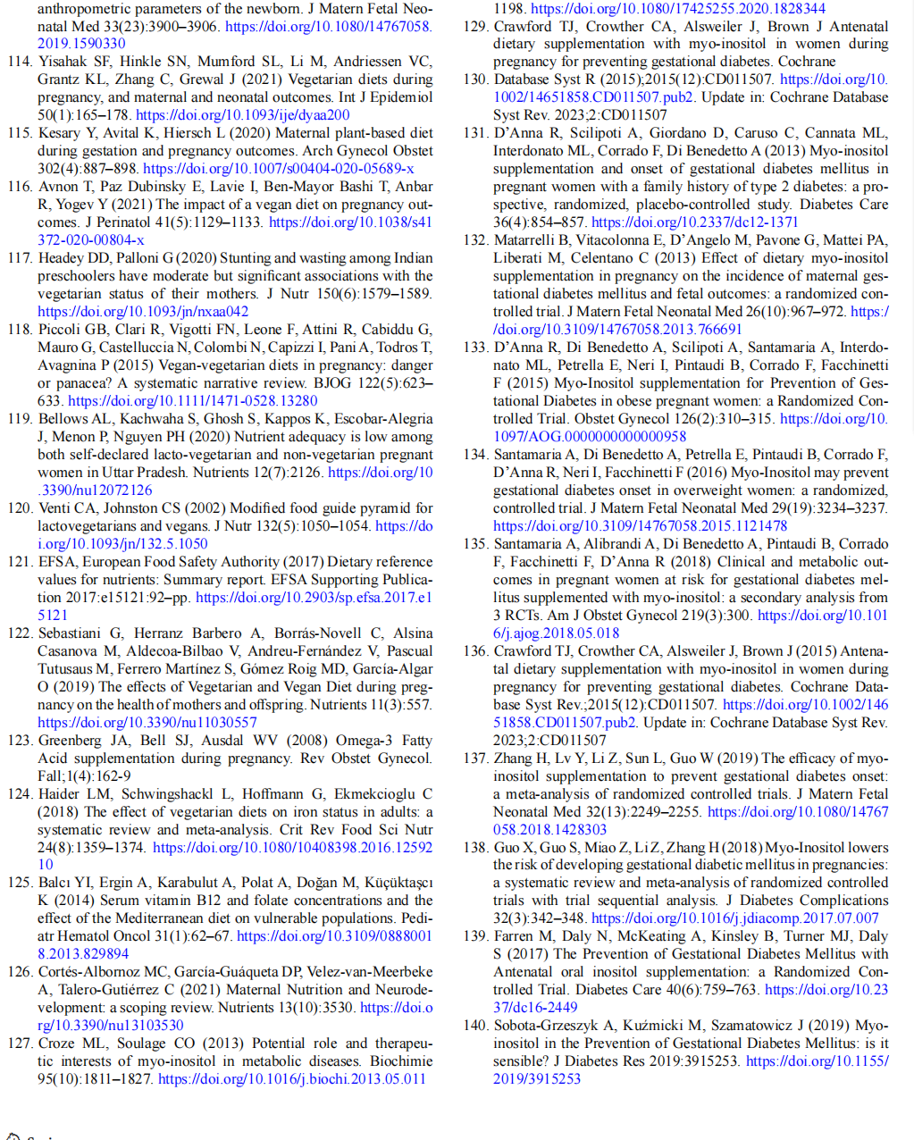 Women with GDM have been found to have higher urinary excretion of inositol and its metabolites and low plasma concentrations of inositol. Much research has there--fore focused on the possible role of inositol in the preven-tion and treatment of GDM [127–140]. Various studies on women with a family history of diabetes or obesity who were treated with inositol have shown a reduction in the devel-opment of GDM and favourable neonatal outcomes, while preterm births were reduced and lower glycaemic values were reported during oral glucose tolerance tests (OGTT) in women at risk. On the other hand, no recommendations have so far been made regarding the use of MI in women of reproductive age for the prevention of GDM; further multi-centre randomised trials with larger populations of different ethnicities are needed, and diet, exercise and pharmacologi-cal interference also need to be evaluated [138].