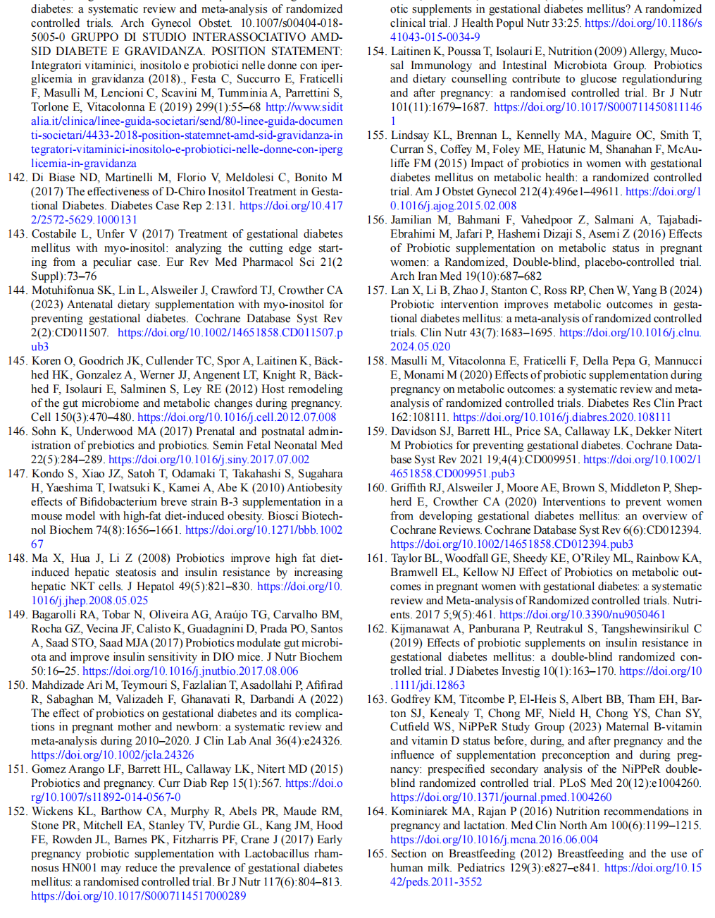 Recent Cochrane reviews [159, 160] of studies of over-weight and obese women showed that treatment with probi-otics affected the risk of GDM compared with a placebo. An increased risk of pre-eclampsia was reported but no other maternal-foetal outcomes were affected. On the other hand, other systematic reviews have found a reduction in insulin resistance (HOMA-IR) and improvements in insulin secre-tion (HOMA-B) and the QUICKI index compared with a placebo, as well as reductions in inflammatory markers and interleukin, and a slight effect of supplementation on triglyceride and total cholesterol levels [161, 162]. More recently, the Nutritional Intervention Preconception and During Pregnancy to Maintain Healthy Glucose Levels and Offspring Health (NiPPeR) study group carried out a multicentre, double-blind, randomised controlled trial [163] with 1,792 women. They evaluated the impact of myo inositol, micronutrients (vitamins D, B6 and B12, ribofla-vin and zinc) and probiotics taken before the beginning of pregnancy on the control of blood sugar during pregnancy and more generally on the health of pregnant women and their offspring. The results showed no significant effects on the incidences of GDM and LGA infants, but a reduction inpreterm births, confirming the results of previous studies. Interestingly, the NiPPeR study also investigated the impact of maternal, preconception and prenatal nutritional supple-mentation with myo-inositol, probiotics and additional micronutrients on offspring outcomes monitored from birth to 2 years of age and found that the supplementation was associated with a lower risk of rapid childhood weight gain and obesity in the offspring at 2 years of age.