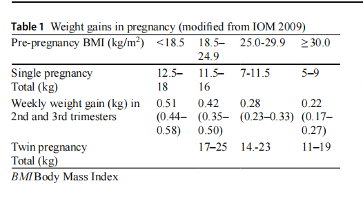No studies have been conducted on the energy needs and required weight gains in twin pregnancies. Instead, theoreti-cal evaluations have been carried out from data from single pregnancies, based on which some authors have hypothe-sised an increase in energy requirements for the 2nd twin of around 150 kcal/day. The Canadian Higgins Nutrition Inter-vention Program, however, recommends an increase of 1000 Kcal per day (500 for each twin) from 20 days [40]. Based on a few studies performed on a single cohort of women, the IOM [38] recommends the following weight increases in twin pregnancies (two foetuses): 16.8 to 24.5 kg for women of normal weight, 14.1 to 22.7 kg for overweight women, and 11.4 to 19.1 kg for obese women. [Level of evidence IV, Strength of recommendation C]. A 2019 study vali-dated the IOM recommendations retrospectively through analysis of 878 twin pregnancies: the results showed, in particular, that a greater weight gain increased the risk of pre-eclampsia and gestational hypertension, a lower weight gain increased the risk of preterm birth, low birth weight, respiratory distress and hospitalisation in a neonatal inten-sive care unit (NICU) [41]. A recent meta-analysis of the appropriateness of the IOM recommendations for different ethnicities (American, European and East Asian) found no risk of small for gestational age (SGA), large for gestational age (LGA), macrosomia or caesarean section in women of different ethnic groups with weight gains above or below the recommendations if specific BMI classes are taken into account for Asian women [42].