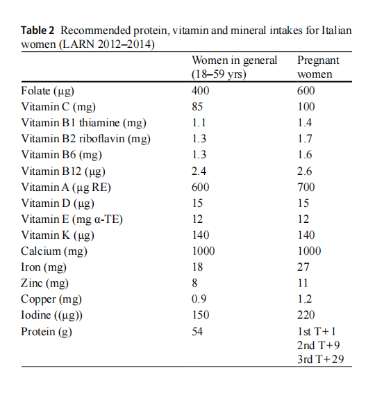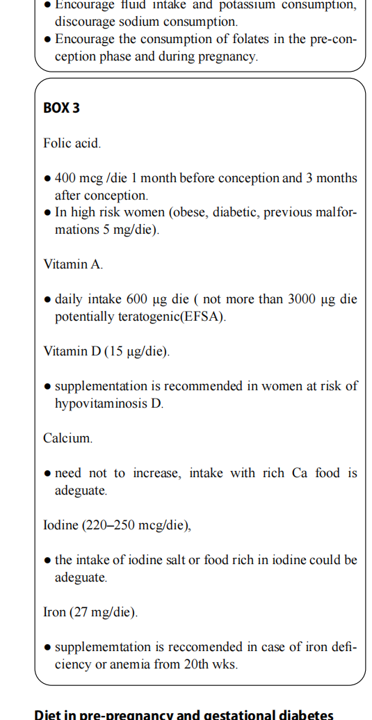 If the woman’s diet is varied and she consumes foods such as fruit, vegetables and milk, all vitamin requirements are guar-anteed and no particular supplementation is recommended, with the exception of folic acid. An increased intake of folic acid during pregnancy of at least 400 micrograms/day has proven effective in preventing spina bifida and anenceph-aly [55, 56]; a supplement of 5 mg/day is recommended for women who have delivered foetuses with neural tube defects, are genetically predisposed to neurological patholo-gies/malformations, or have pre-gestational diabetes or obe-sity [57] [Level of evidence I, Strength of recommendation A]. Folic acid supplementation should be started one month before conception and continued during pregnancy up to the 12th week of gestation [57]; women at high risk of adverse maternal and foetal outcomes are advised to begin supple-mentation of 5 mg/day 3 months before conception [57]. The risk of toxicity from supplements and/or foods fortified with folic acid is low [57] as it is a water-soluble vitamin and the excess is eliminated via urine. LARN guidelines set the maximum tolerable limit in pregnancy at 1000 µg/day; neurotoxicity is documented for intakes>5000 µg/day [37].