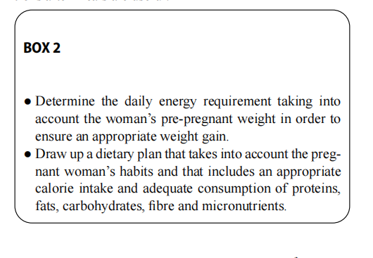 Correct nutrition is an indispensable requirement for a suc-cessful pregnancy. An adequate increase in body weight and a good nutritional status are necessary to meet maternal energy demands and provide the foetus with the nutrients needed for its development [30–32]. During pregnancy, pro-found metabolic changes linked to hormonal variations are partly responsible for ever-increasing energy needs. In the second half of gestation, rapid foetal growth and increased cardiovascular and respiratory rates raise the basal metabo lism by 60%, but by about 30% in overweight women [33, 34]. The increase in maternal fat mass is the most vari-able component of weight gain, contributing to the energy costs of pregnancy and correlating positively with weight gain [32], especially in obese women [35, 36]. Although there is an estimated total additional energy requirement of ⁓76,000 kcal during the entire pregnancy (associated with a maternal weight gain of approximately 12 kg), there is inter-individual variation in energy expenditure, linked not only to weight gain but also to nutritional status [37]. The mag-nitude and composition of appropriate weight gain differ significantly between women depending on their pre-preg-nancy BMI [38] (Table 1). In general, in the first trimester, unless the woman enters pregnancy with insufficient energy reserves (as in the case of underweight women), the calorie requirement does not need to be increased. From the second