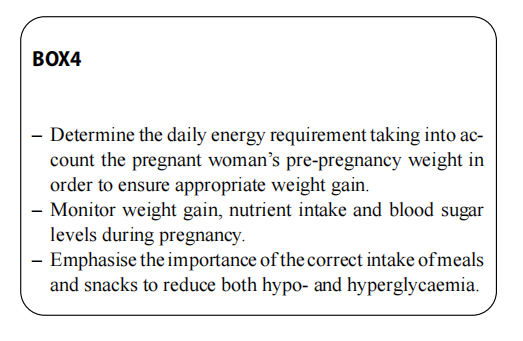 The objective of Medical Nutrition Therapy (MNT) in preg-nant women with diabetes is to ensure good maternal and foetal nutrition, that provides an adequate intake of macro-and micro-nutrients, guarantees optimal glycaemic control and avoids ketonuria/ketonemia [64, 65].