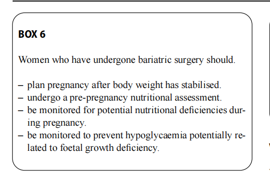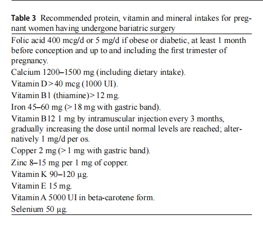 According to the guidelines [104, 105], it is advisable to carry out a thorough clinical evaluation and assessment of nutritional status before pregnancy, particularly in women who have lost weight after surgery but remain overweight or obese. It is important to monitor deficiencies in micronutri-ents, in particular Vitamins A, D and B12, potassium, iron, folate, calcium and phosphorus, and to prescribe vitamin and mineral supplements before conception and through-out pregnancy. Folic acid, in particular, must be taken (400 mcg/day, 5 mg/day if obesity persists) at least 1 month before conception and throughout the entire first trimester of pregnancy. Multivitamins containing vitamin A in the form of retinol must be stopped. Macronutrient deficienciesalso need to be checked.