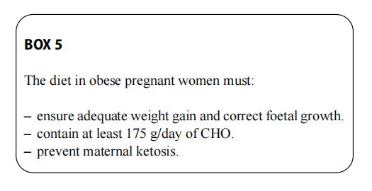 According to recently published work, weight gains lower than those recommended for class 3 obese women or for weight loss may be acceptable during pregnancy only if individually determined to ensure an adequate carbohydrate intake to prevent ketosis and foetal growth is monitored. Moderate caloric restriction (20–25 Kcal/kg) while ensuring an adequate intake of proteins and carbohydrates for the ges-tational age may be the best strategy to manage weight gain during pregnancy. Even in obese pregnant women, caloric and carbohydrate intake must not fall below 1500 kcal/day and 175 g/day, respectively, and there must be an adequate intake of micro- and macro-nutrients to prevent the risk of malnutrition, ketosis and SGAnewborns [65, 93]