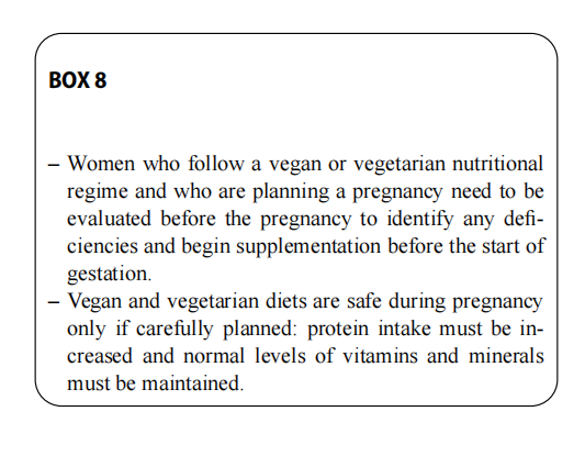 Vegetarian diets typically include plant foods and exclude most types of animal-derived foods. There are two main types of vegetarian diets: (1) lacto-ovo-vegetarianism (LOV): meat is excluded, but dairy products, eggs, honey and a wide variety of plant foods are included; (2) vegan-ism (VEG): meat, fish and all animal derived foods such as dairy products, eggs and honey are excluded, while a wide variety of plant foods are included [110–112]. A plant-based diet can be sufficient for a pregnant woman only if well planned so that it provides the recommended requirements for energy and nutrients, such as proteins, fibre, omega-3, fatty acids, zinc, iodine, calcium, vitamin D and vitamin B12. Careful meal planning is necessary to avoid nutritional deficiencies [113, 114]. [Level of evidence I, Strength of recommendation A].