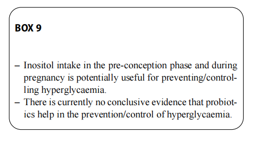 In recent years, there has been growing interest in the role of nutraceuticals in the prevention and treatment of hypergly-caemia in pregnancy. These nutraceuticals are nutrients and/ or bioactive compounds that are contained in some foods, especially those of plant or microbial origin, and that have beneficial effects on human health. The focus has, in par-ticular, been on inositol and probiotics (128).