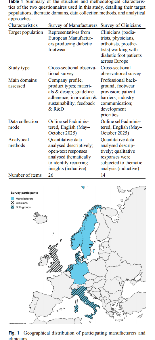 To address these gaps, two separate questionnaires were developed and sent to a sample of diabetic footwear manu-facturers and clinicians working in diabetic foot care across Europe. This study aimed to explore the challenges, oppor-tunities, innovations, and areas of divergence in priorities between these two stakeholders.