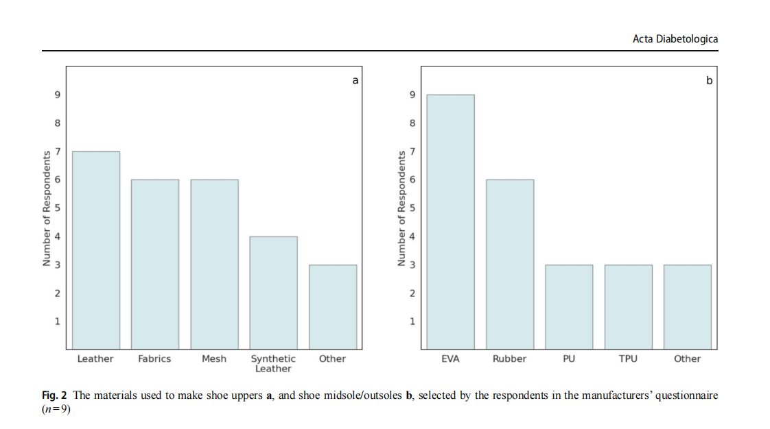 For the diabetic shoe upper, the respondents specified using leather (n=7), fabrics (n=6), mesh (n=6), synthetic leather (n=4), and other materials (n=3), including combi-nations of materials or other synthetic materials. As for the shoe midsole/outsole, they reported using ethylene-vinyl acetate (EVA) (n=9), rubber (n=6), polyurethane (PU) (n=3), thermoplastic polyurethane (TPU) (n=3), or other materials (n=3), for instance, a specific combination of EVA and rubber, or thermoplastic rubber (Fig. 2).