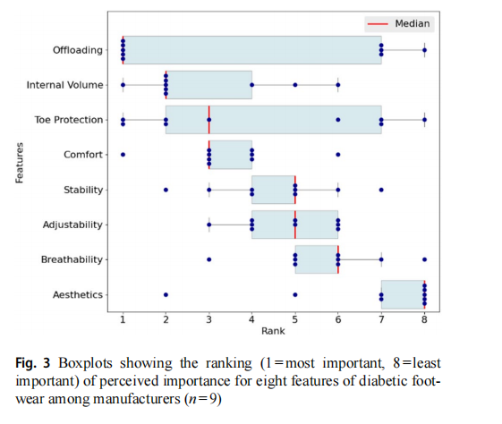 The results shown in Fig. 3 highlight the significance of offloading, higher internal volume and toe protection as the top three priorities for diabetic shoes. Offloading showed the most significant variation in ranking positions. Comfort, stability, adjustability, and breathability fell within ranks 4 to 7, while shoe aesthetics consistently ranked lowest.Manufacturers use a variety of methods to enhance the stability of diabetic footwear. The most reported were incor-porating a reinforced heel counter (n=7), larger outsole (n=6), and an anti-slip outsole (n=6), while the use of an ankle-high upper (n=4), harder midsole materials (n=3), and arch support (n=2) were less commonly chosen. Other
