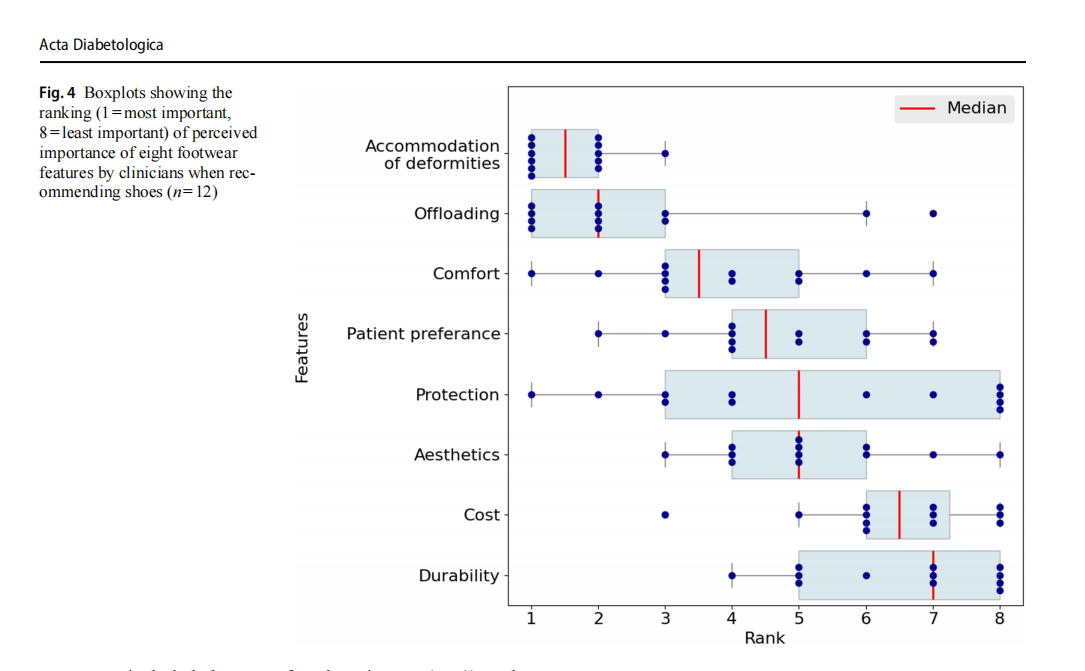 The participants were asked to rank eight footwear fea-tures in order of importance for their footwear recommen-dations. Accommodation of foot deformities was ranked highest among the footwear features by clinicians, fol-lowed by offloading capabilities and comfort. Other factors, such as patient preference, protection, and aesthetics, were ranked in the middle, while cost and durability were the lowest-ranking features of diabetic shoes (Fig. 4).