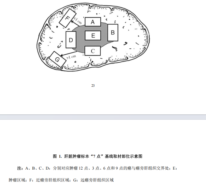 肝癌周边交界区域是肿瘤生物学行为的代表性区域。为此要求采用“7 点”基线取材法(图 1),在肿瘤的 12 点、3 点、6点和 9 点位置上于癌与癌旁肝组织交界处按 1∶1 取材;在肿瘤内部至少取材 1 块;对距肿瘤边缘≤1 cm(近癌旁)和>1 cm(远癌旁)范围内的肝组织分别取材 1 块。距肿瘤最近切缘及另送组织需分别取材,实际取材的部位和数量还需根据肿瘤的直径和数量酌情增加取材[105-106]。肿块型和混合型 ICC 标本取材时参照“7 点”基线取材法;管周浸润型 ICC 标本取材时,推荐沿受侵胆管壁纵向剖开取材,并对胆管切缘进行取材。对单个肿瘤最大直径≤3 cm 的小肝癌,应全部取材检查(证据等级3,推荐 A)。