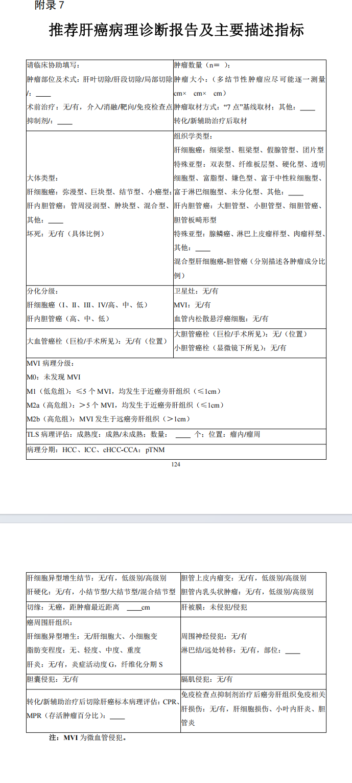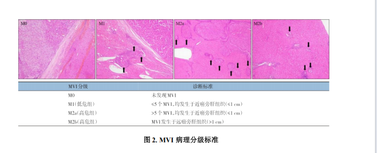 MVI 是指在显微镜下于内皮细胞衬覆的脉管腔内见到的癌细胞巢团[106],HCC 以门静脉分支侵犯(含包膜内血管)最为多见,ICC 可有淋巴管侵犯。MVI 病理分级方法主要针对HCC[117]:M0:未发现 MVI;M1(低危组):≤5 个 MVI,且均发生于近癌旁肝组织(≤1 cm);M2(高危组):M2a 定义为>5个近癌旁 MVI,且无远癌旁 MVI;M2b 定义为 MVI 发生于远癌旁肝组织(>1 cm)(图 2)。MVI 各组患者的术后复发转移风险依次增加,临床预后依次降低。MVI 和卫星灶可视为肝癌发生肝内转移过程的不同演进阶段,当癌旁肝组织内的卫星灶与 MVI 难以区分时,可一并计入 MVI 病理分级。MVI 是评估肝癌术后复发转移风险和选择治疗方案的重要病理依据[104,106],应作为组织病理学常规诊断指标。MVI 病理分级是建立在“7 点”基线取材的基础上评估的,当送检标本不能满足“7点”基线取材时,应在 MVI 分级时加以说明。在诊断 ICC 时建议报告有无脉管(血管/淋巴管)侵犯(证据等级 2,推荐 A)。