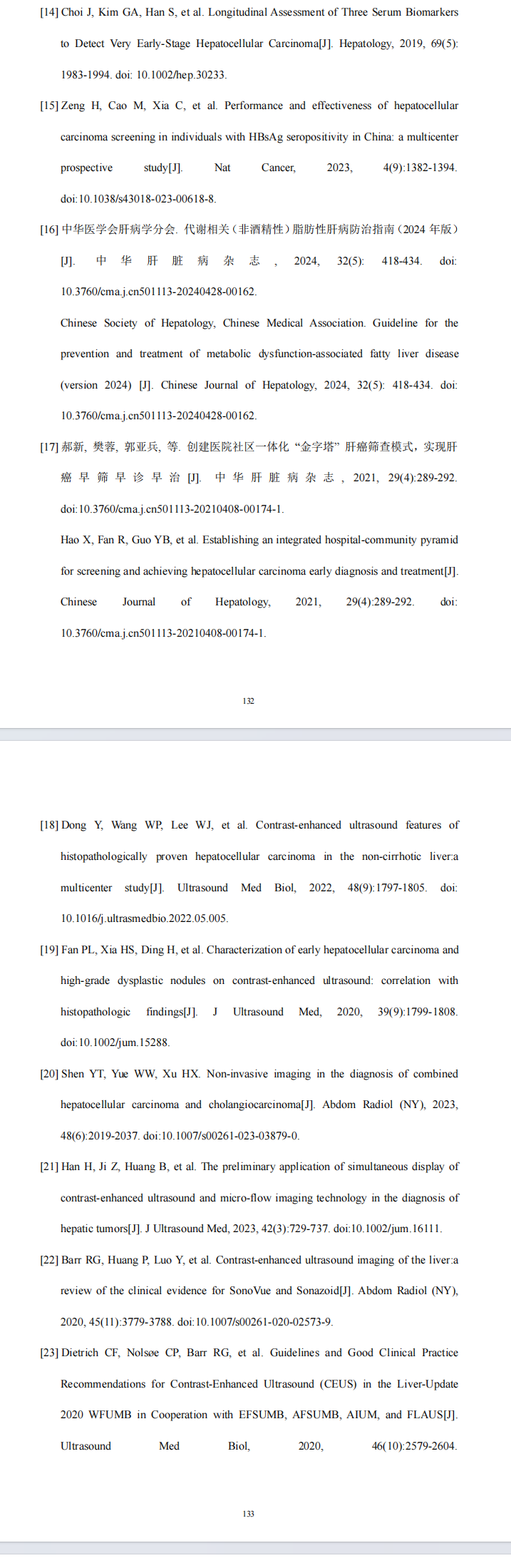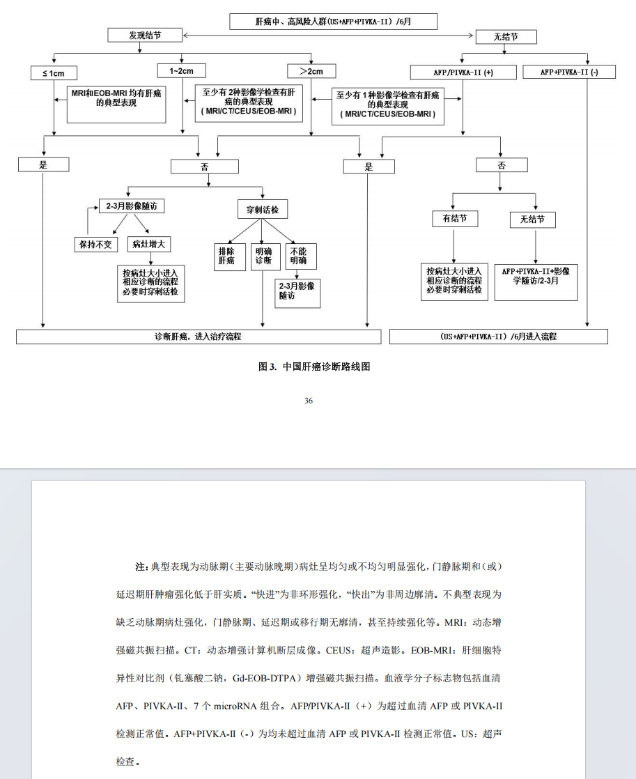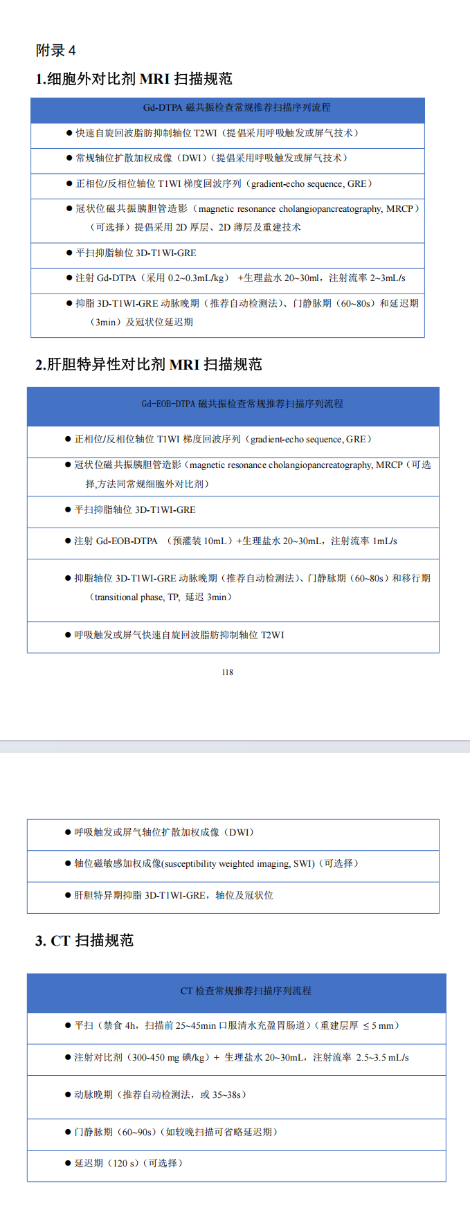 (1)动态增强 CT/MRI 扫描、Gd-EOB-DTPA 动态增强MRI 检查以及超声造影是肝脏超声检查和(或)血清 AFP、PIVKA-II 筛查异常者明确诊断的影像学检查方法。