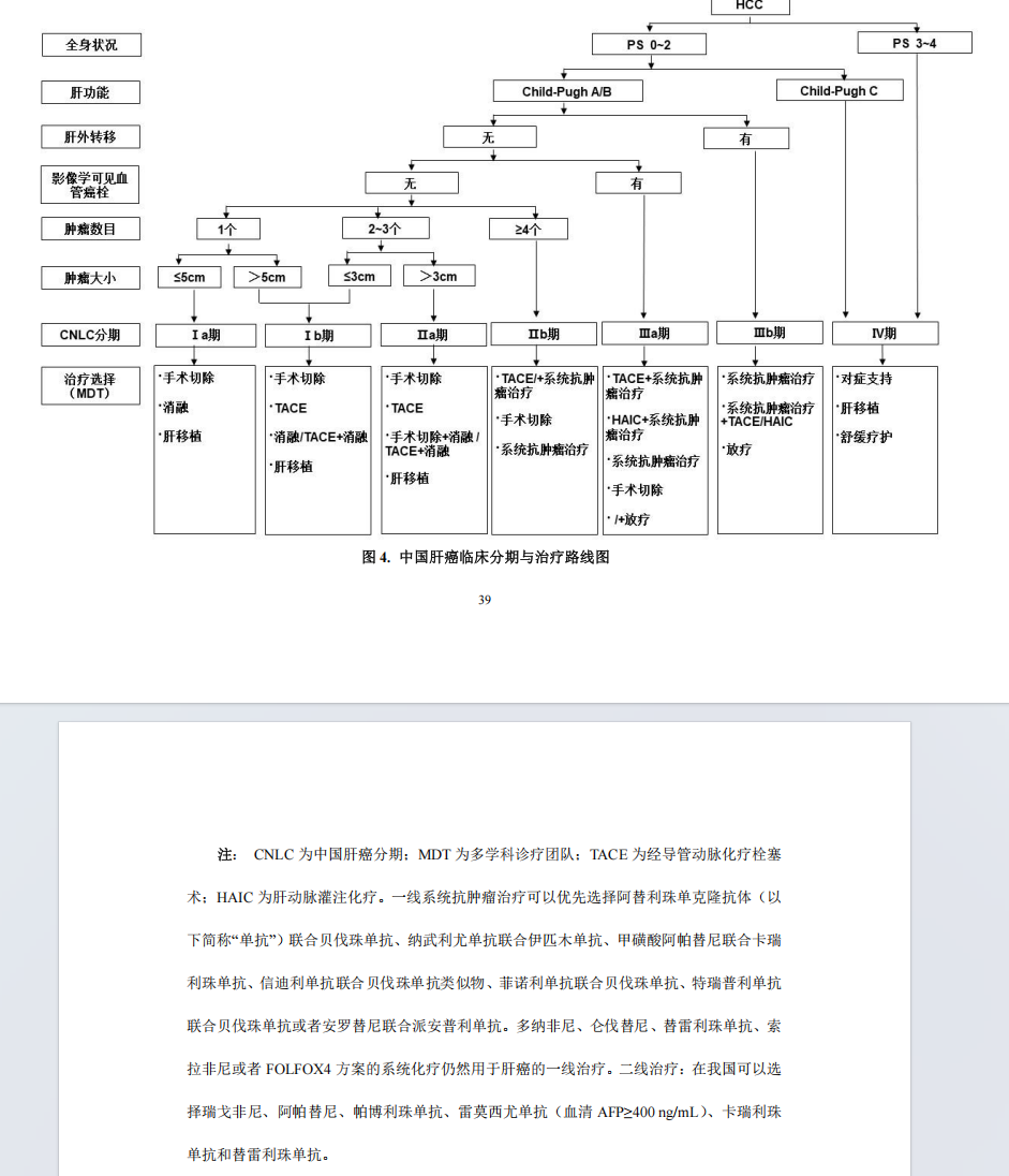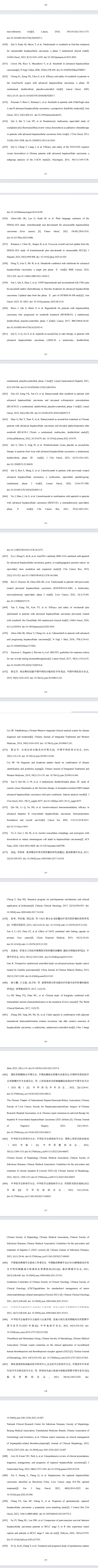(3)二线系统抗肿瘤治疗方案,在我国可以选择瑞戈非尼、阿帕替尼、帕博利珠单抗、雷莫西尤单抗(血清AFP≥400 μg/L)、卡瑞利珠单抗或替雷利珠单抗。对于一线接受免疫联合方案、免疫单药或酪氨酸激酶抑制剂单药治疗的患者,二线治疗方案选择可以考虑根据疾病进展方式和具体一线方案不同,选择未曾使用过的一线治疗的药物或获批的二线治疗药物,鼓励患者自愿参加新药的临床试验。