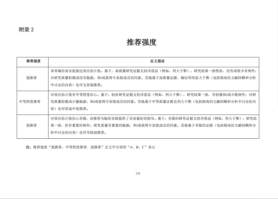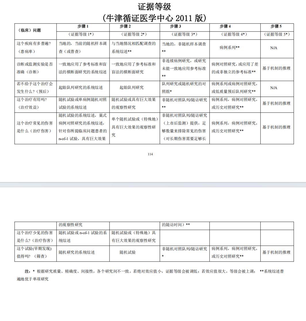 证据评价与推荐意见分级、制定和评价方法学(grading ofrecommendations,assessment,development and evaluation,GRADE),是目前使用最广泛的证据评价和推荐意见分级系统[5]。GRADE 系统包括两部分,第一部分为证据评价,根据证据中的偏倚风险、不一致性、间接性、不精确性和发表偏倚,GRADE 系统将证据质量分为高、中、低和极低四个水平[6]。第二部分为推荐意见分级,GRADE 系统考虑医学干预的利弊平衡、证据质量、价值观念与偏好,以及成本与资源耗费等因素来制定推荐意见,并且将推荐意见分为强推荐和弱推荐(有条件推荐)两种[7]。医学干预的利弊差别越大,证据质量越高、价值观念与偏好越清晰越趋同、成本与资源耗费越小,则越应该考虑强推荐,反之,则应考虑弱推荐(有条件推荐)。本指南中的循证医学证据等级评估参照了上述 GRADE 分级的指导原则,采用了《牛津循证医学中心分级 2011 版》(OCEBMlevels of evidence)作为辅助工具来具体执行证据分级(证据等级 1~5)(附录 1)。在从证据转换成推荐意见的方法上,指南专家组主要参考了上述的 GRADE 对推荐意见分级的指导原则,同时结合了美国临床肿瘤学会(ASCO)指南的分级方案[8]对推荐意见分级作了相应的修改(附录 2)。最终将推荐强度分为三个等级,分别是强推荐、中等程度推荐和弱推荐(指南正文中分别用推荐 A、推荐 B 和推荐 C 表示)。强推荐(推荐 A)代表专家组对该推荐意见反映了最佳临床实践有很高的信心,绝大多数甚至所有的目标用户均应采纳该推荐意见。中等程度推荐(推荐 B)代表专家组对该推荐意见反映了最佳临床实践有中等程度的信心,多数目标用户会采纳该推荐意见,但是执行过程中应注意考虑医患共同决策。弱推荐(推荐 C)代表专家组对该推荐意见反映了最佳临床实践有一定的信心,但是应该有条件地应用于目标群体,强调医患共同决策。