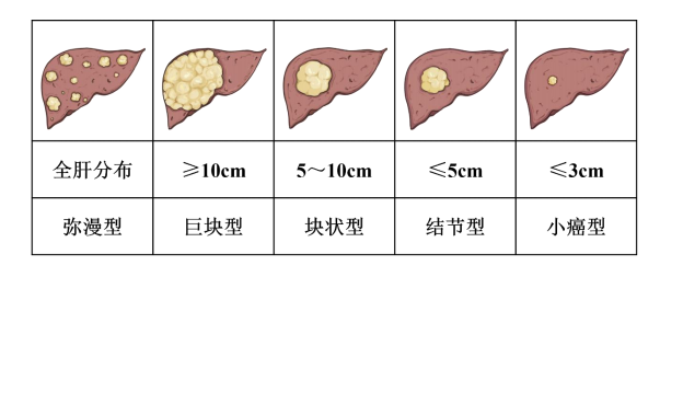 (3)块状型:最大直径肿瘤介于 5~10 cm 的单发或多发肿瘤;