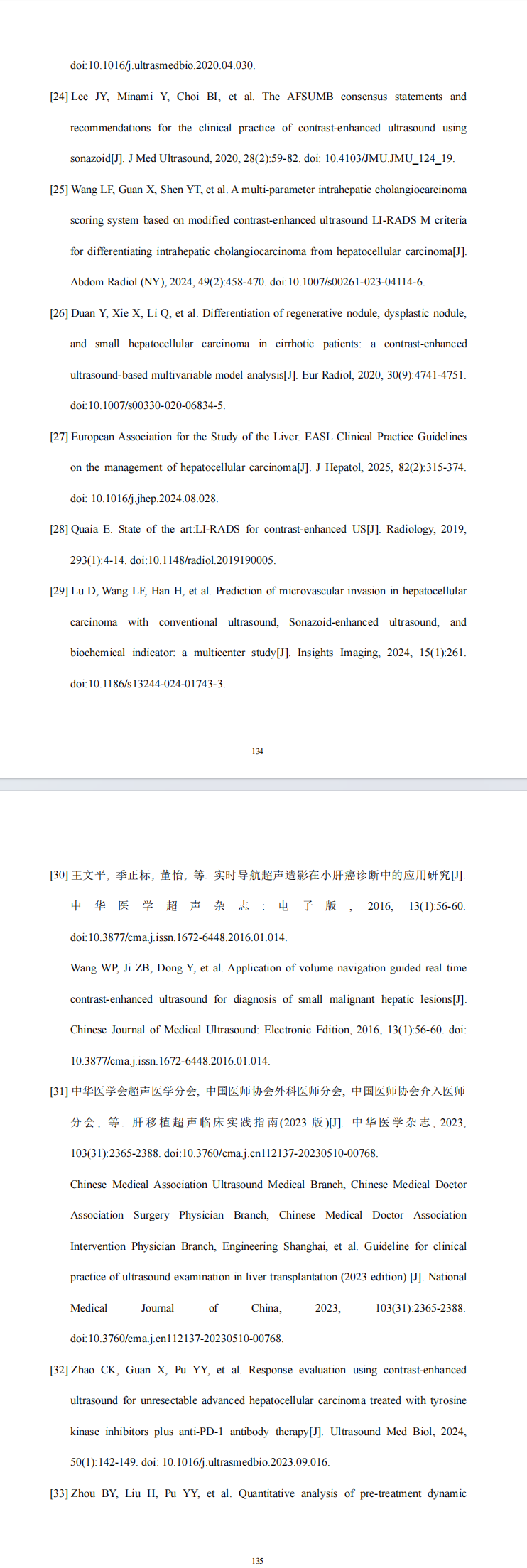 定量超声造影可测量造影剂到达时间、达峰时间、渡越时间、峰值强度、血流灌注量等指标,可用于评估系统抗肿瘤治疗(化疗、靶向治疗、免疫治疗等)后的疗效以及早期预测患者对系统抗肿瘤治疗的反应性,辅助临床决策[32-33]。基于超声造影的超分辨超声成像技术,可更清晰显示肝癌微血管(直径可小至 0.05 mm),有望提高对肝癌的诊断及疗效评估能11力[34-35]