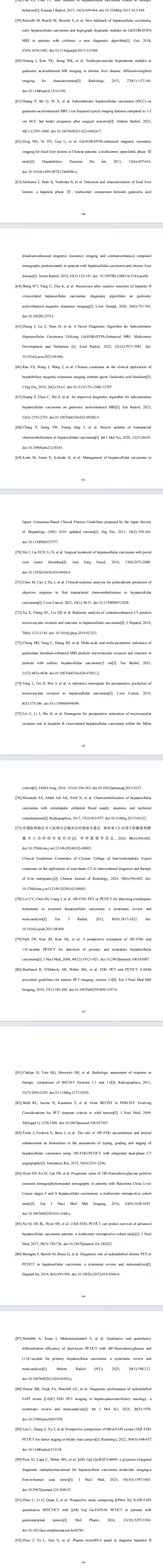 (1)正电子发射断层成像(positron emission tomography,PET):包括 PET/CT 和 PET/MR 融合影像。目前,PET 常用的 显 像 剂 为 氟 -18- 脱 氧 葡 萄 糖 ( 18F-flurodeoxyglucose ,18F-FDG),18F-FDG PET/CT 或 PET/MR 全身显像的优势在于:① 对肿瘤进行分期,通过一次检查能够全面评价有无淋巴结转移及远处器官的转移[78-79](证据等级 1,推荐 A);②再分期,因 PET 功能影像不受解剖结构的影响,可以准确显示解剖结构发生变化后或者解剖结构复杂部位的复发转移16灶[80](证据等级 2,推荐 B);③对于抑制肿瘤活性的靶向药物的疗效评价更加敏感、准确[81-82](证据等级 2,推荐 A);④指导放射治疗生物靶区的勾画、确定穿刺活检部位[80];⑤评价肿瘤的恶性程度和预后[83-85](证据等级 2,推荐 B)。18F-FDGPET 显像对肝癌诊断的敏感性和特异性有限,可作为其他影像学 检 查 的 有 益 辅 助 和 补 充 。 采 用 碳 -11 标 记 的 乙 酸 盐(11C-acetate)或胆碱(11C-choline)等显像剂 PET 显像可以提高对高分化肝癌诊断的敏感度,与 18F-FDG PET 显像具有互补作用[86-87]。镓-68(68Ge)或 18F 标记的成纤维细胞活化蛋白抑制剂(fibroblast activation protein inhibitor,FAPI)PET显像可有效提高对于肿瘤间质成分丰富的肝癌原发灶、转移灶的诊断灵敏度,对 18F-FDG PET 显像具有补充作用 [88-89](证据等级 3,推荐 C)。68Ge 标记的磷脂酰肌醇蛋白聚糖 3(glypican-3,GPC-3)PET/CT 显像由于肝脏本底背景低,有望提高肝癌的诊断及分期敏感度[90]。PET/MR 具有软组织分辨率高,且可行多参数成像的特点,对肝癌病灶显示更加清晰,同时因为没有 CT 辐射相较 PET/CT 的普适性更好。