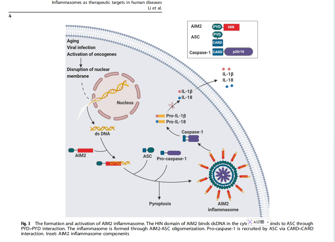 Inflammasomes are intracellular multimeric complex molecules that recognize either pathogen-associated molecular patterns (PAMPs) or danger-associated molecular patterns (DAMPs).1,2 The nucleotide-binding oligomerization (NOD)-, leucine-rich repeat (LRR)-, and pyrin domain-containing 3 (NLRP3) and the NOD-, lRR-, and CARD-containing 4 (NLRC4) inflammasomes belong to the NOD-like receptor (NLR) family.3,4 Non-NLR proteins, such as absent in melanoma 2 (AIM2), form inflammasomes that can sense cytosolic double-stranded DNA.5,6