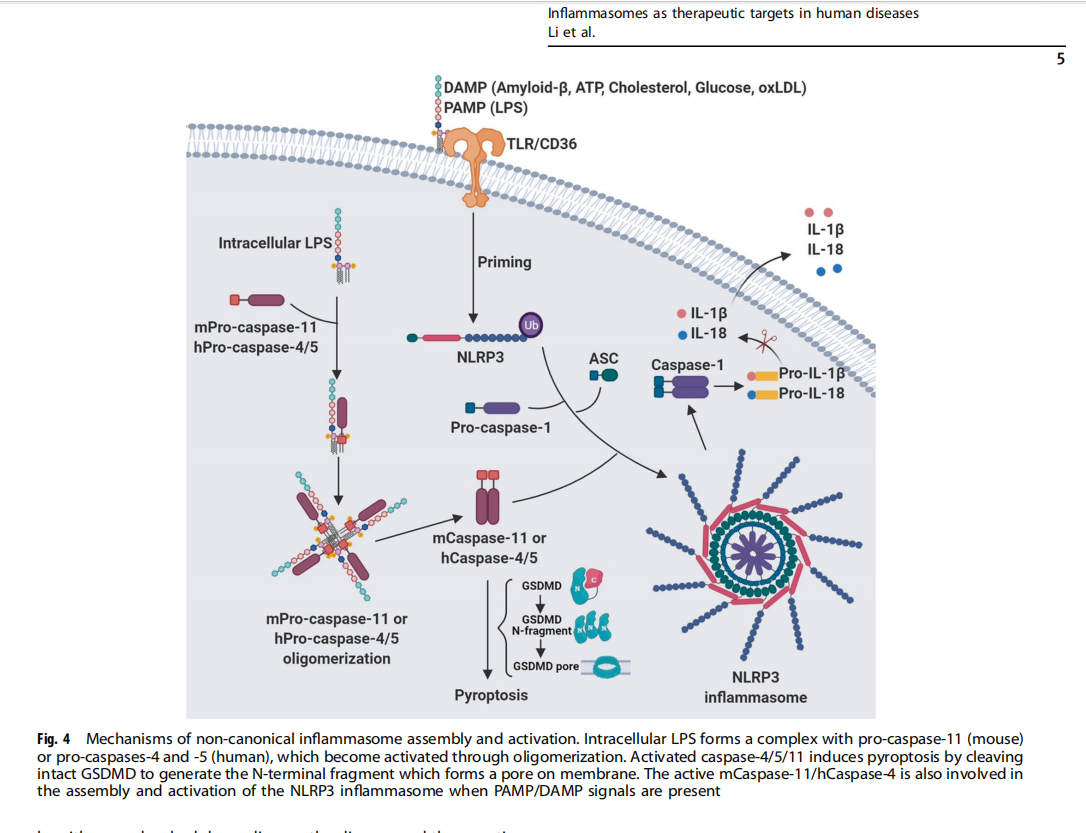 activates caspase-1 by forming a complex with ASC. The NLRP1, NLRP3, NLRC4, and AIM2 inflammasomes were termed as “canonical inflammasomes” because all of these inflammasomes are capable of activating caspase-1. The “non-canonical” inflam-masome was recently discovered by several research teams when searching sensors for intracelluar LPS and upstream activator of caspse-11.12,30,31 They showed that, rather than triggering the activation of caspase-1, the non-canonical inflammasome activate caspase-11 in mice and caspase-4 and caspase-5 in humans in response to LPS. Activated caspase-4/5/11 cleaves intact GSDMD to generate the N-terminal fragment which bind to cell membrane, oligomerize, and form pores to induce pyroptosis (Fig. 4).