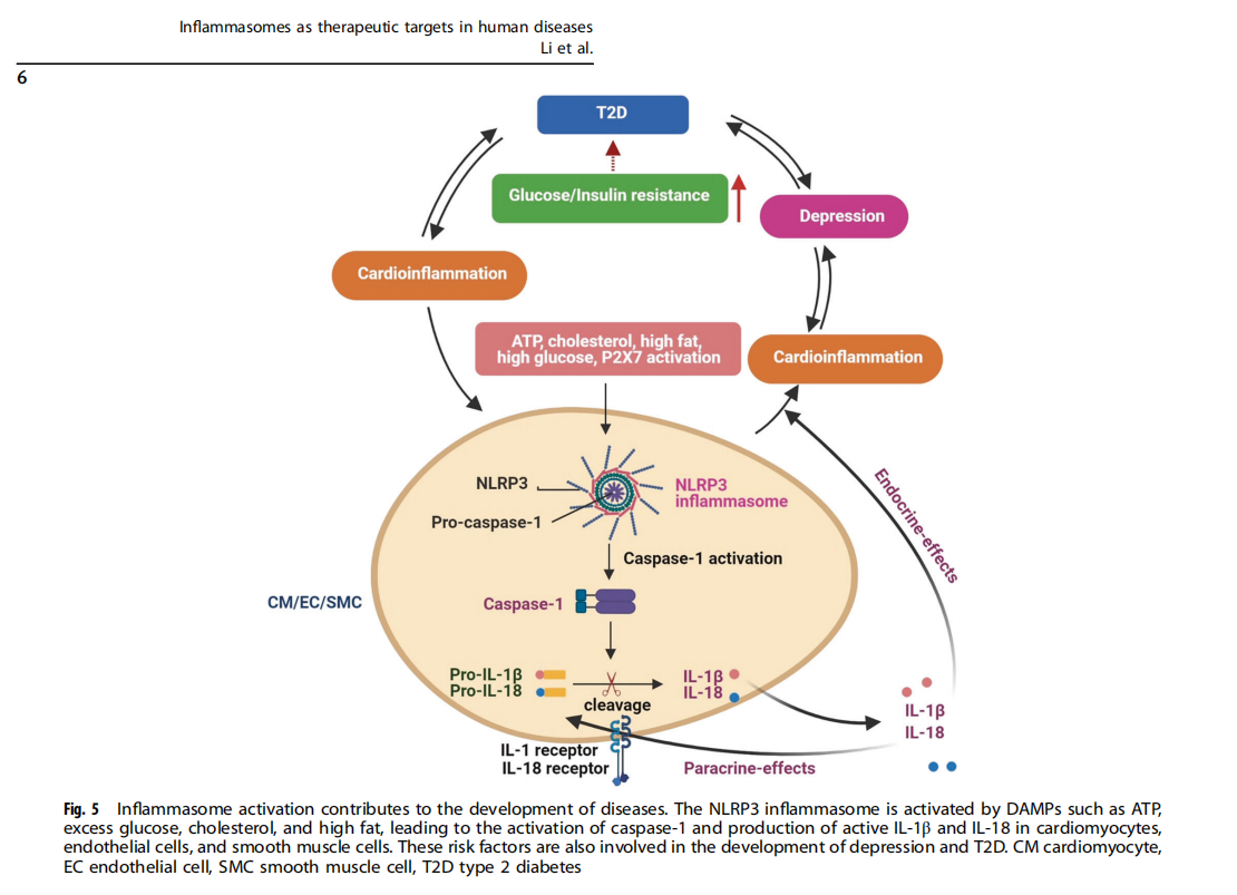 Two studies shed new light on the mechanisms underlying NLRP3 inflammasome activation. Extracellular ATP and neutrophils are abundant in the early stages of inflammation. ATP—induced activation of NLRP3 inflammasome and secretion of IL-1β is mediated by ionotrophic P2X7 receptors (P2X7R).82 IL-1β interfere with insulin signaling in depressed patients, leading to insulin resistance and T2D. Moreover, increased levels of IL-1β can trigger inflammation of the central nervous system, leading to reduced concentrations of serotonin (Fig. 5).83 Because P2X7R -mediated NLRP3 inflammasome activation is implicated in the development of both diabetes and depression, we expect that novel interven-tions targeting the P2X7–NLRP3–IL-1β pathway will reduce insulin resistance, leading to potential treatments for both depression and diabetes.
